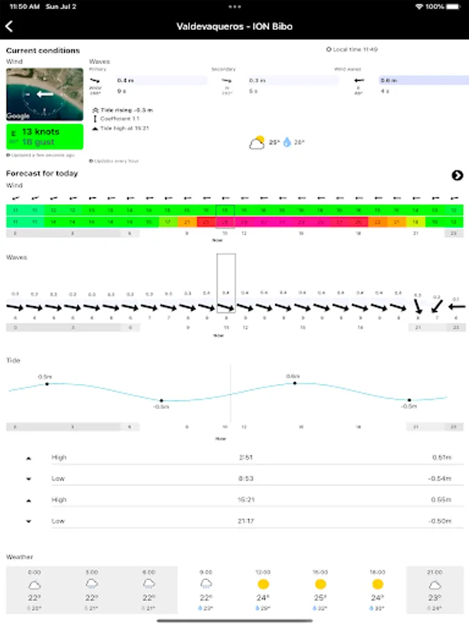 - Current weather conditions for all spots.