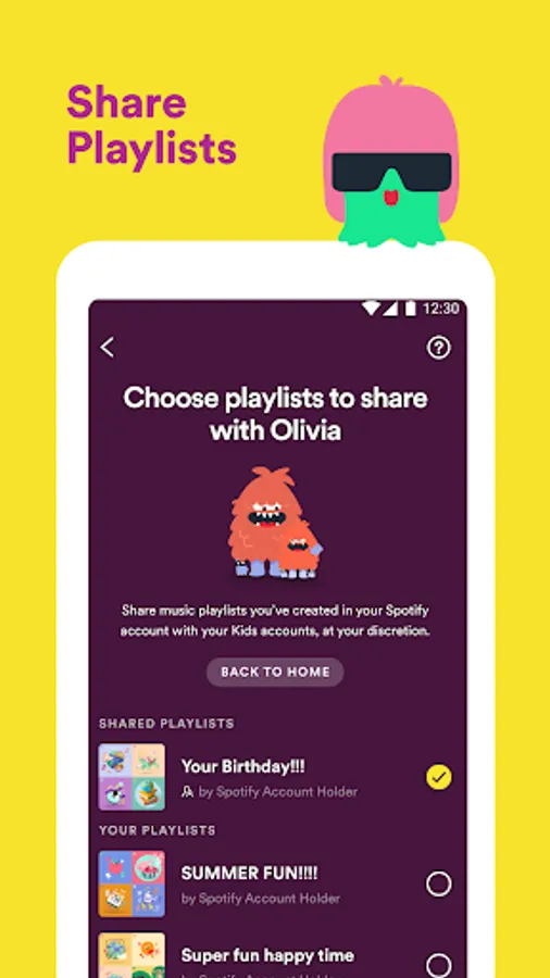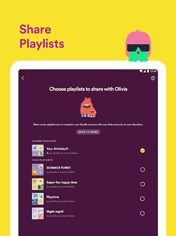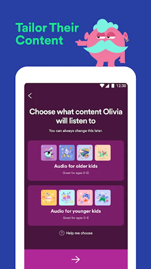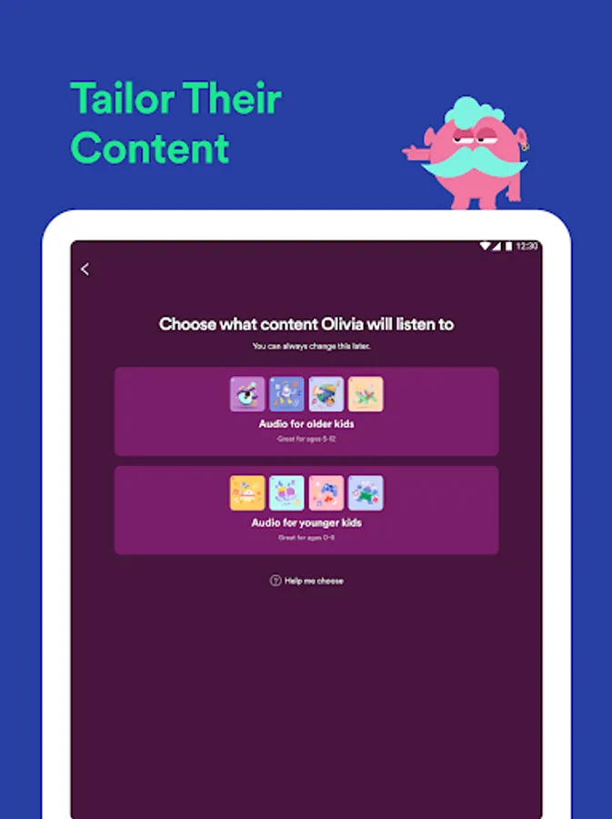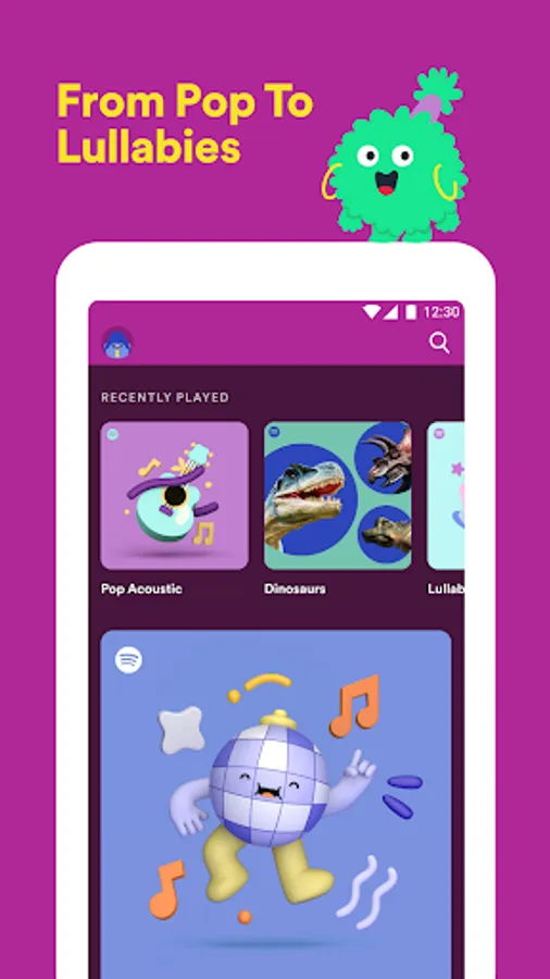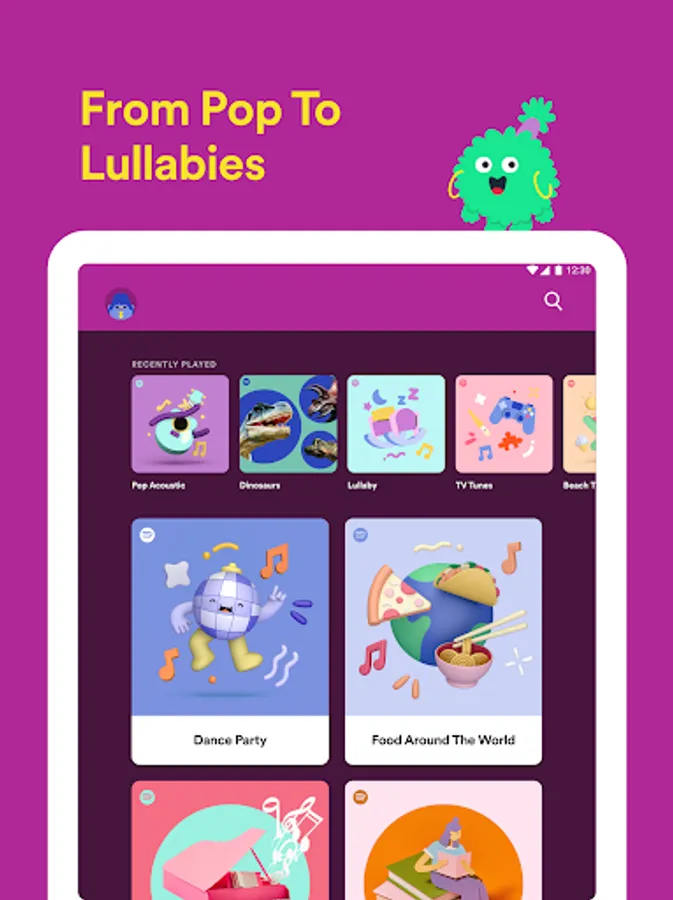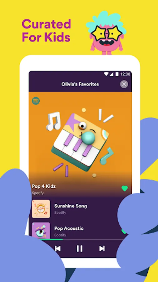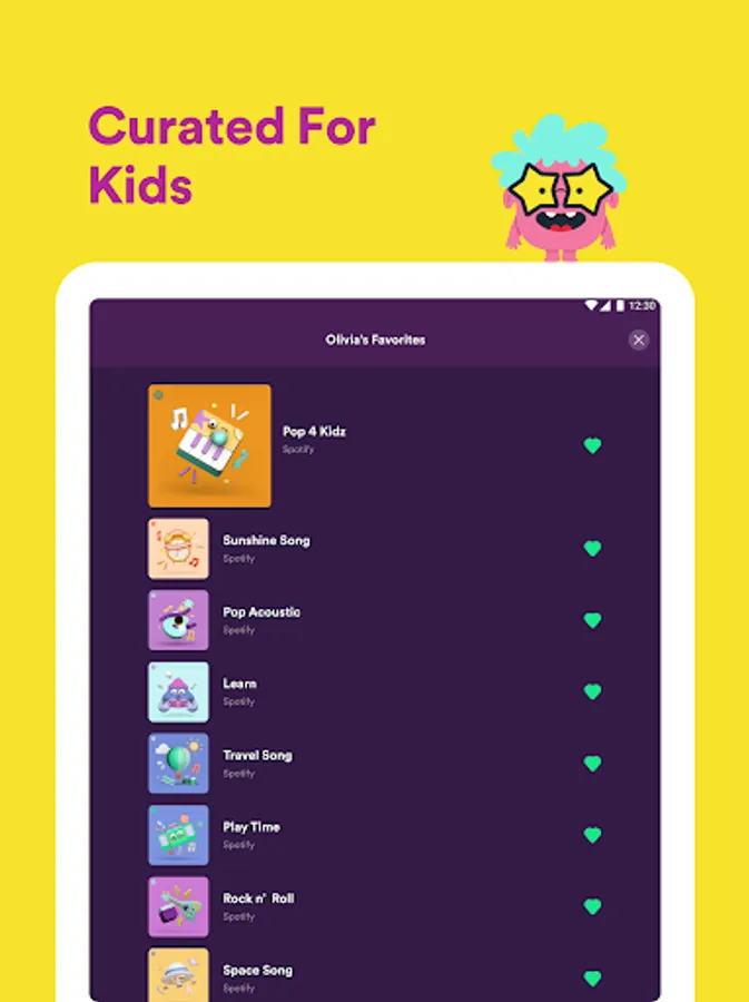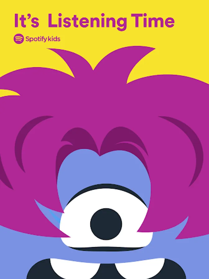 Introduce your child to a playground of sound with Spotify Kids. Packed with singalongs, soundtracks and playlists made for young listeners, the app is an easy way for children of all ages to discover music in a fun environment. Included with a Spotify Premium Family subscription. Try Spotify Kids free for 1 month with a Premium Family trial. Cancel anytime, terms apply.
