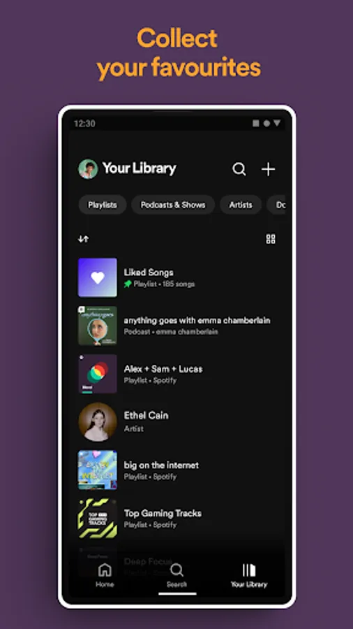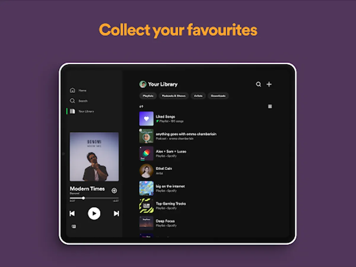 • Listen to music and podcasts on your mobile, tablet, desktop, PlayStation, Chromecast, TV, Wear OS or wearable device.