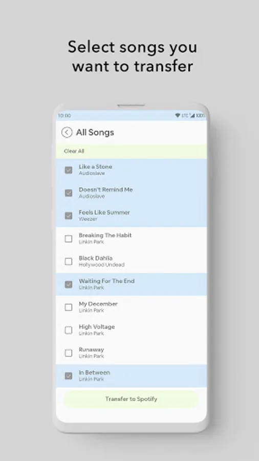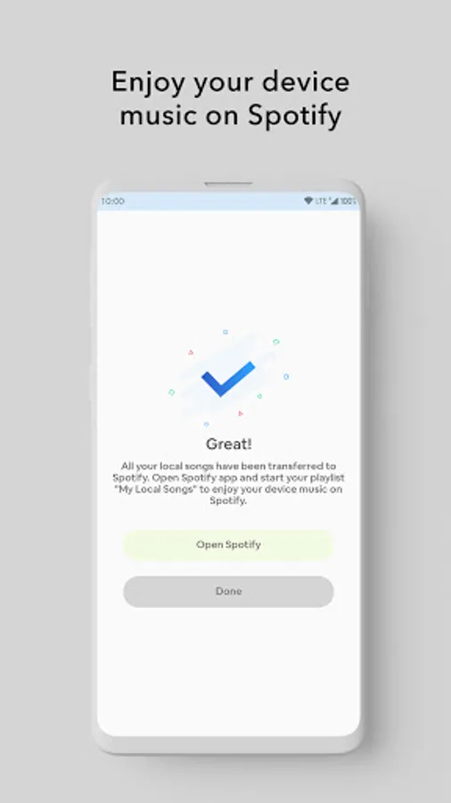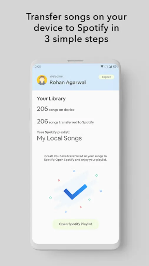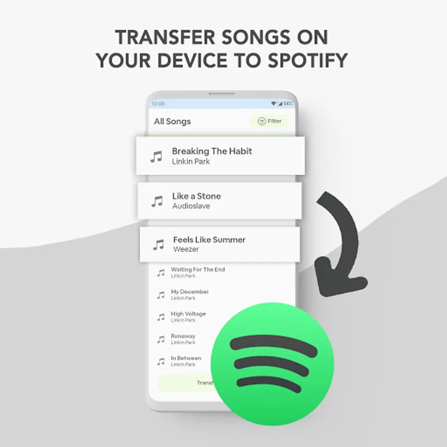 Transfer to Spotify helps you transfer local songs and music on your device to Spotify as a Spotify playlist. Once transferred you can remove the songs from your device to clear up device storage and can also listen to songs on multiple devices via Spotify.