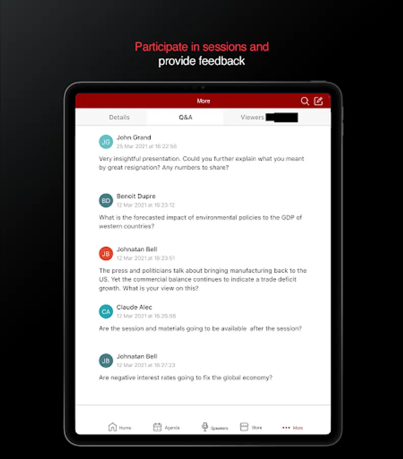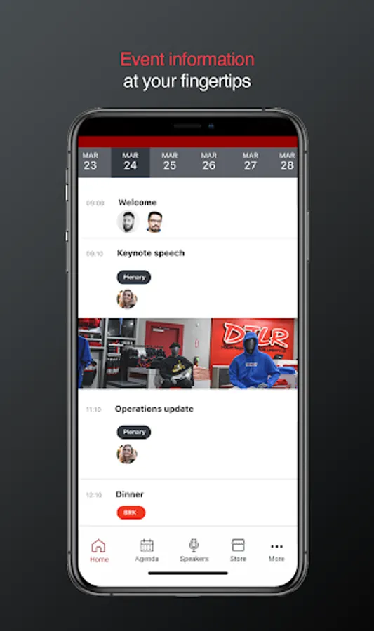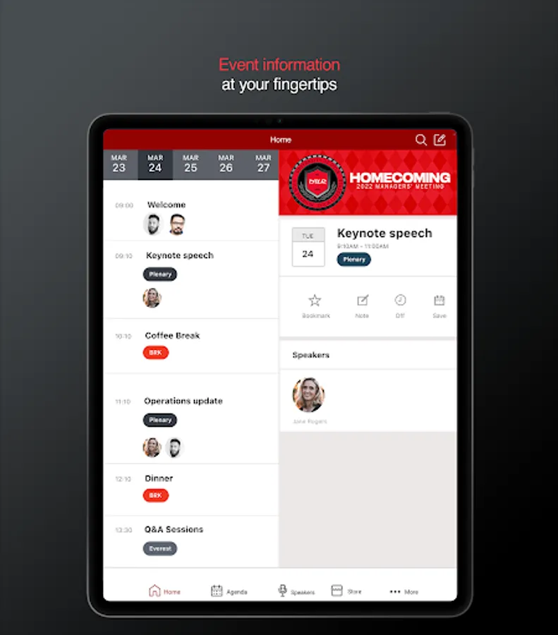 - Activity Feed - the real-time pulse of the event. See what people are saying, view photos from the event, and find trending sessions and topics. - Agenda - view the full agenda and related information (session time, room number, speaker info, etc)