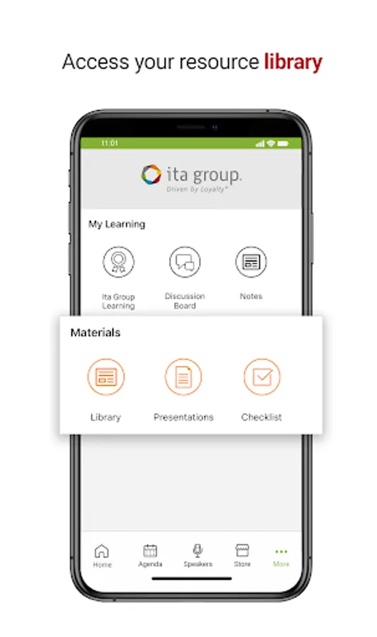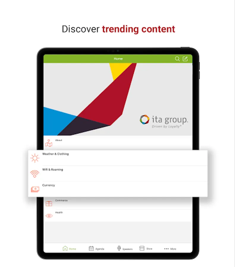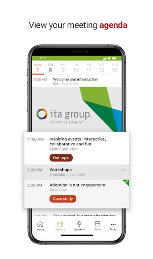 The ITA Group Corporate Events app puts all conference details in team members' pockets. The interactive technology offers instant access to a personalized agenda and an event map so attendees always know where they're going and what's up next. The ITA Group Corporate Events app also allows team members to:
