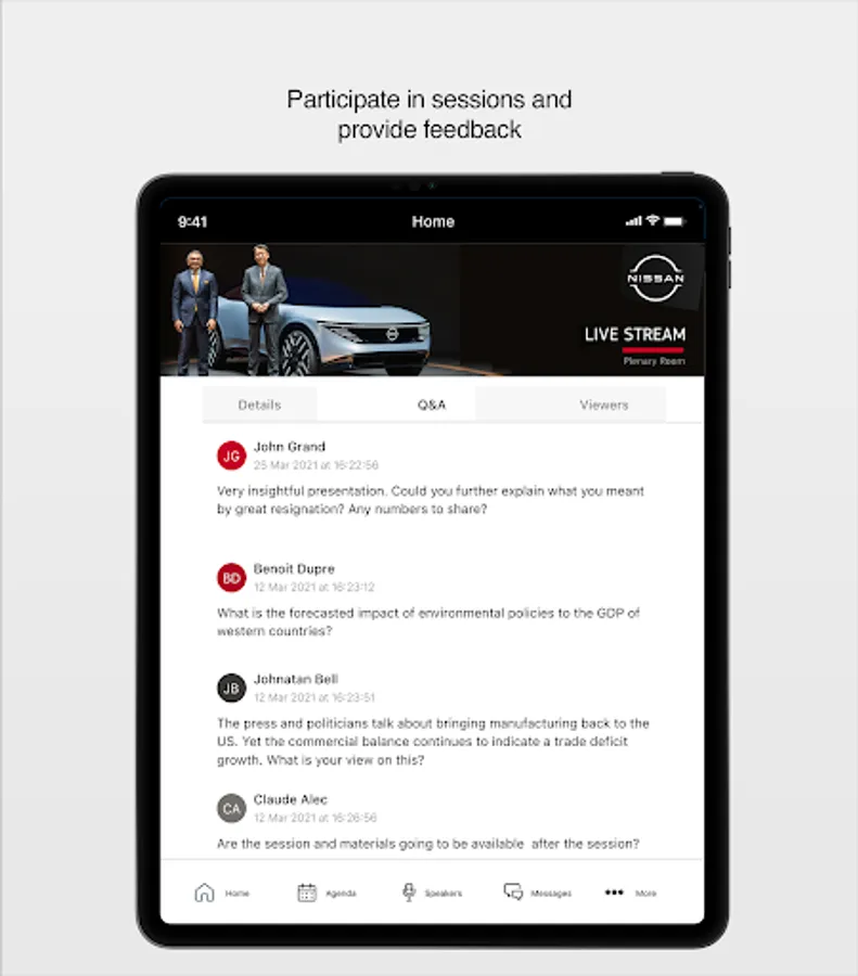 Nissan Meetings & Events is the official mobile app for events allowing you to view program related information, agendas, and more. After you download this app, refer to your announcement email for instrucitons on accessing your event.