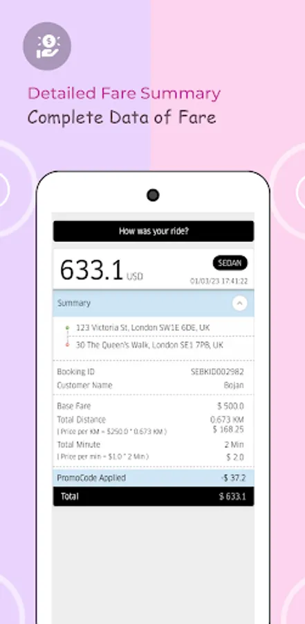 Notification - Drivers will be getting the ride details once they have accepted the ride. This also indicates the driver’s performance and service feedback after the ride is completed successfully.
