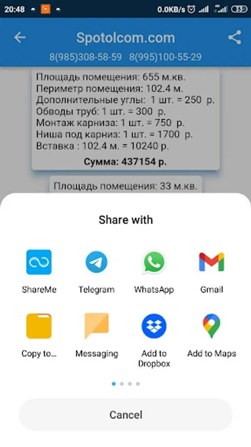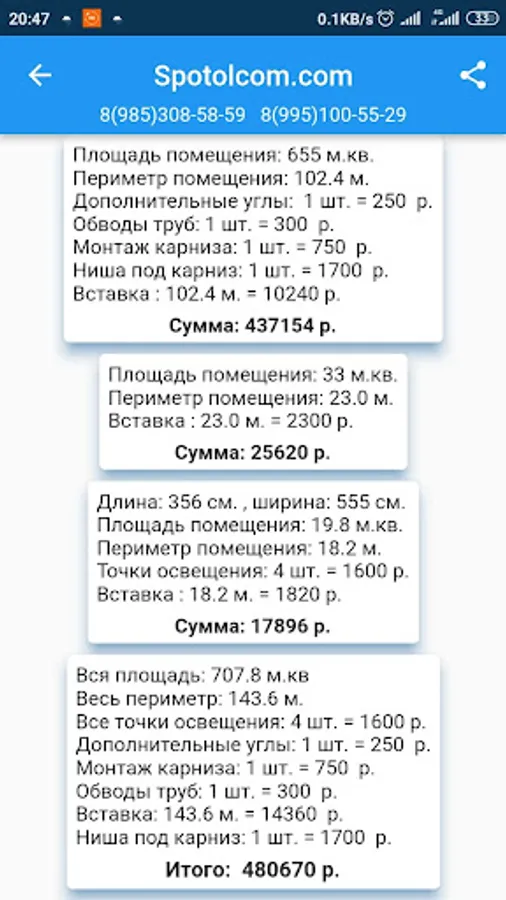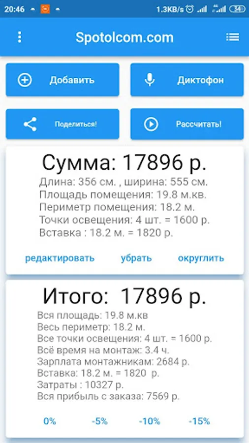 Calculates the cost of work by the width and length of the room, or by area. It is possible to add additional services. Calculates the cost of installing lighting, bypassing pipes, add. corners, inserts, etc.