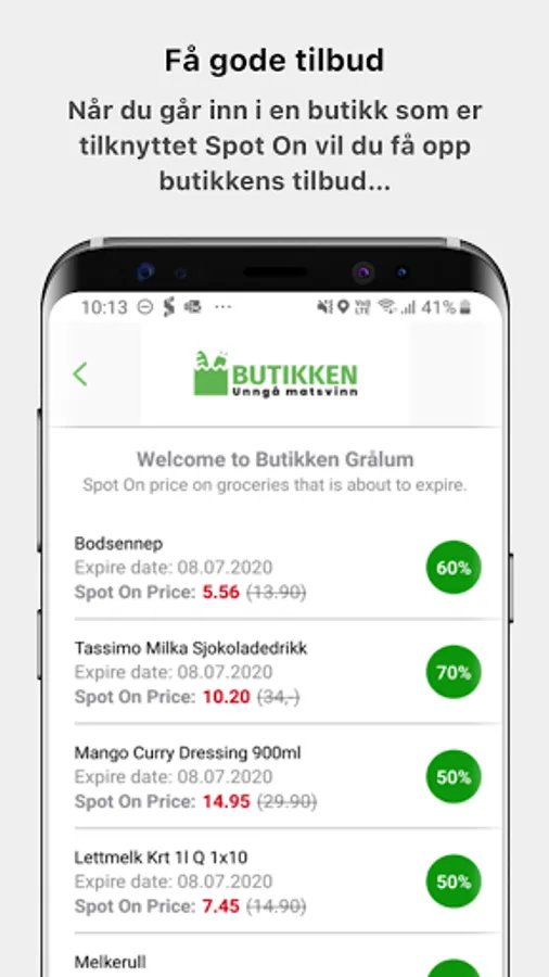 Think environment and shop smart with the free Spot On app. The new Spot On app gives you an overview of all spot products at greatly reduced prices in stores in different industries. The goods may be approaching the expiry date, damaged packaging, returned goods, party purchases etc. In addition to the list of spot goods you will be able to see the store's current offer newspaper.