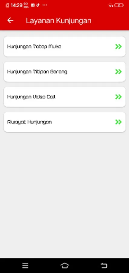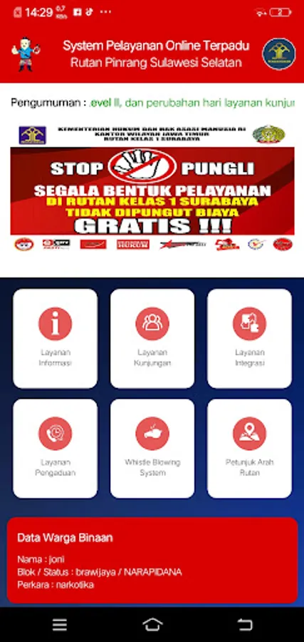 an integrated online service application for the Pinrang Prison. A system that is integrated with the services and complaints of the Pinrang Prison. Has features for ordering online queues for face-to-face visits, depositing goods and video calls, as well as online complaint services and downloading the PB CB form.