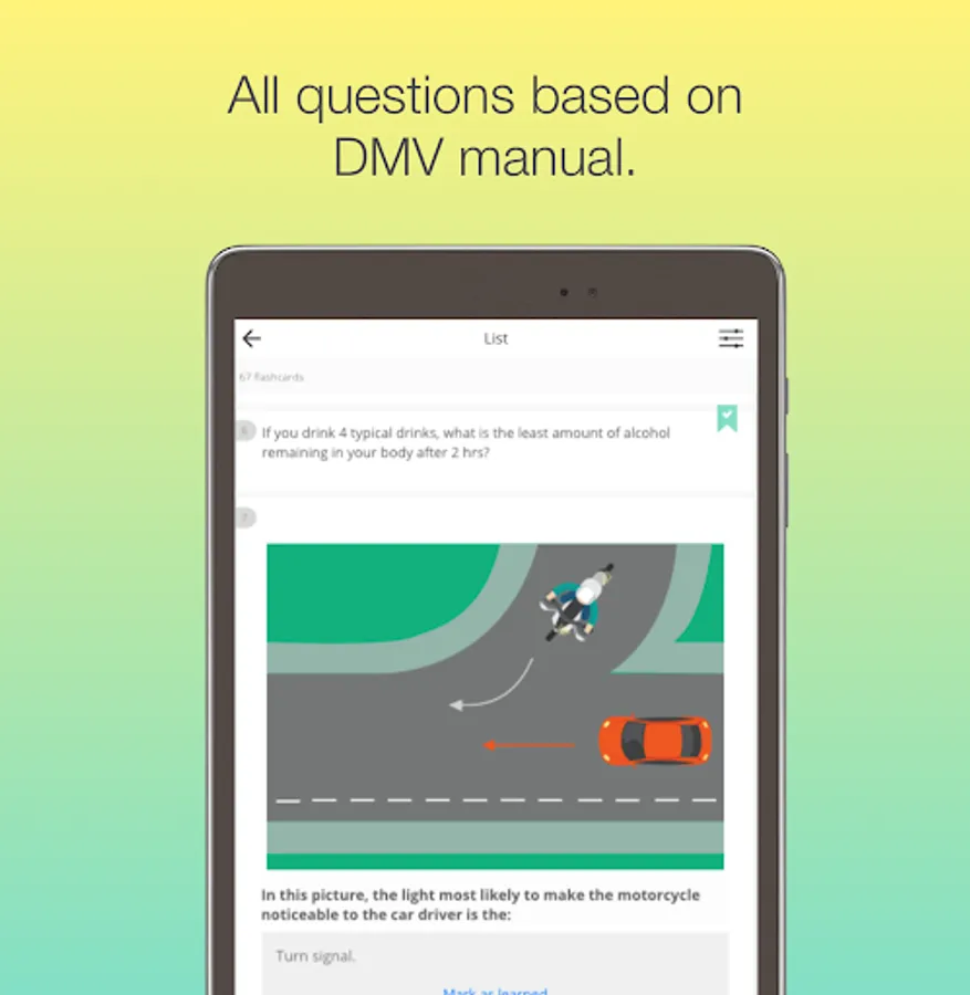 -The Marathon Test, which gives you an opportunity to explore all available Motorcycle's DMV CA ( California ) Knowledge test questions.