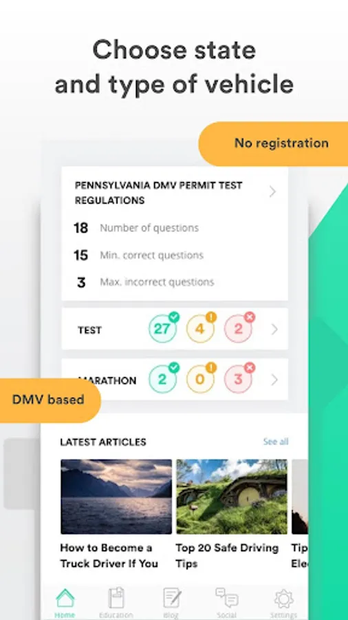 Download this helpful Driver Start app to be fit and firing for your driver's permit test! Based on the official 2023 Manuals of all states, it helps a lot in your preparation for the DMV driver's license test by providing easy and convenient tools for learning all those laws, signs, and situations, as well as for effective training before your exam. This Driver Start app prepares you for all kinds of knowledge permit tests, including the CDL test and motorcycle test. Just launch the app whenever you feel comfortable and practice the knowledge test questions while you are on the go!