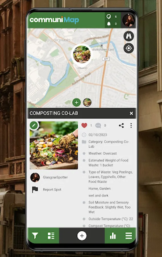 CommuniMap invites you to see your local area through fresh eyes - by tuning in to nature, movement, and the daily rhythms that shape your surroundings. Whether you’re walking, wheeling, noticing local trees, or composting at home or elsewhere, CommuniMap provides a space to reflect on what you see and share your observations, contributing to a vibrant community map. This shared resource allows us all to learn from and connect with one another through our collective experiences.