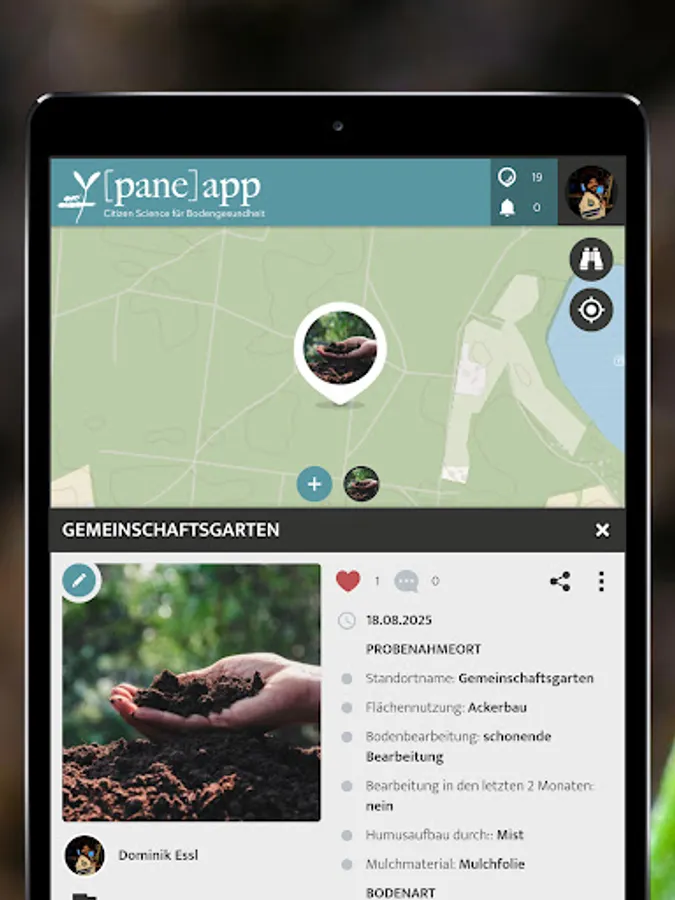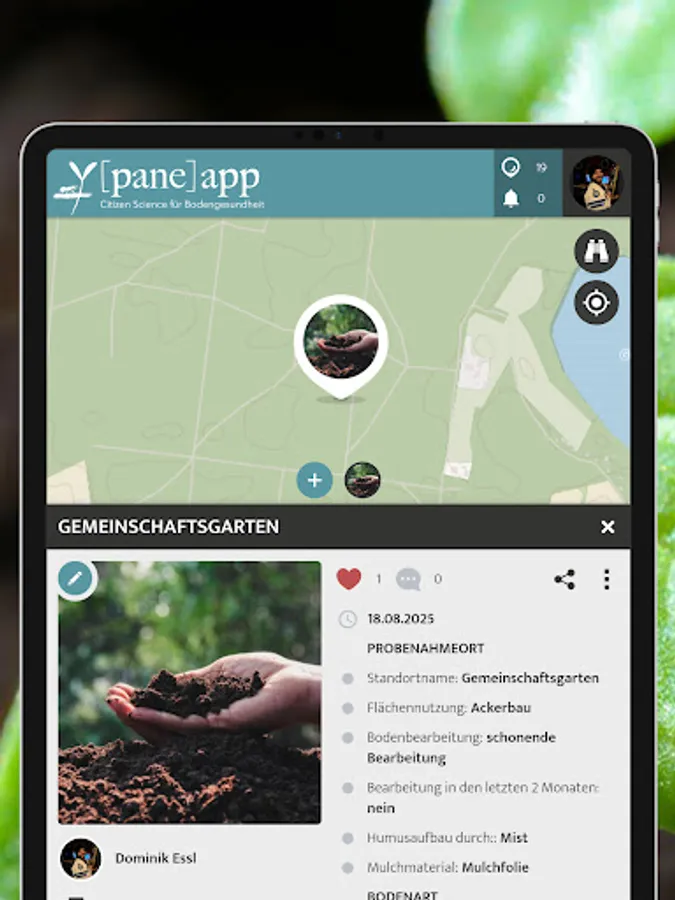 With the [pane] app, you can record several important indicators of soil health, including humus content, water retention capacity, and earthworm populations. Recording accompanying data such as soil type, weather, and cultivation method will help you better understand the results. Info panels in the app guide you through the individual investigations.