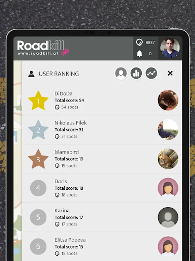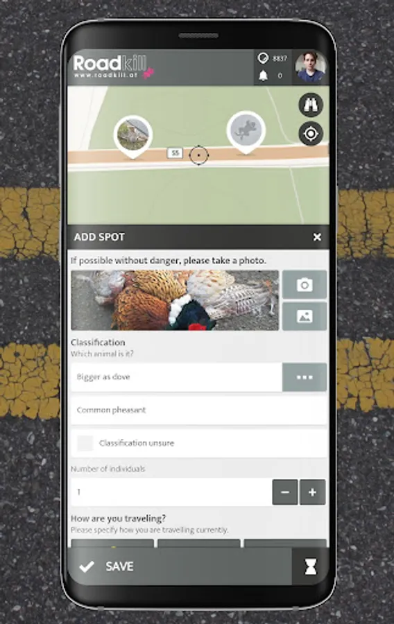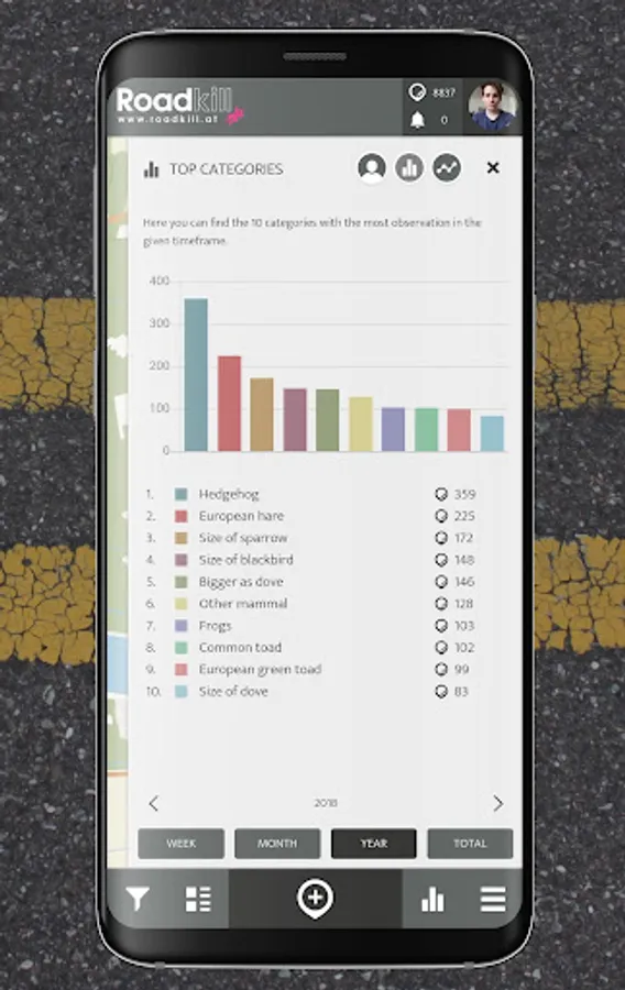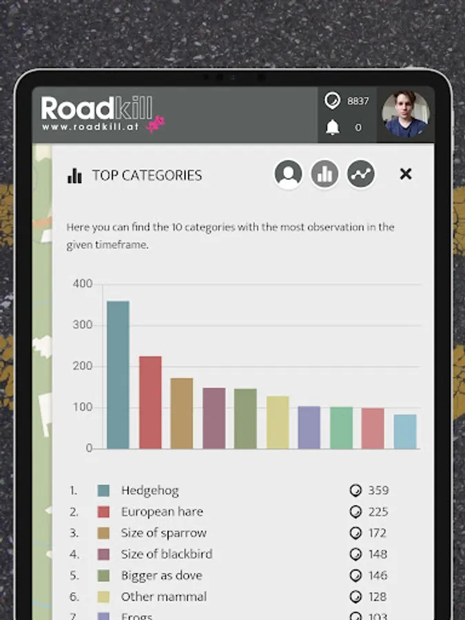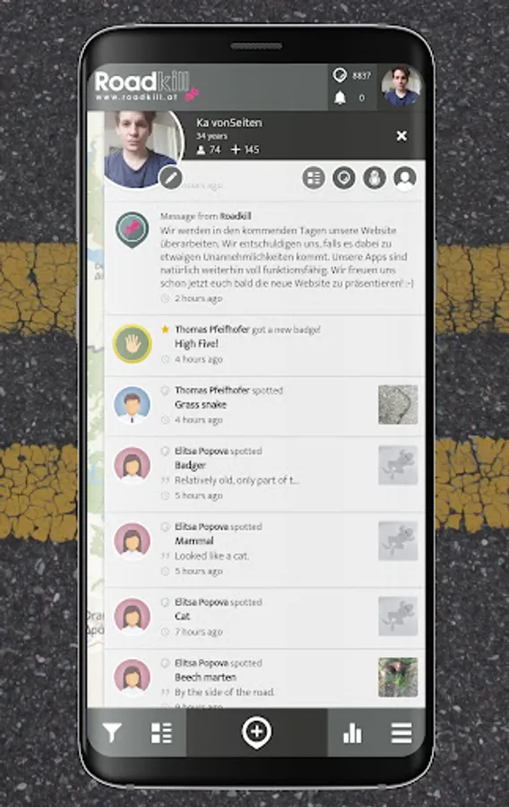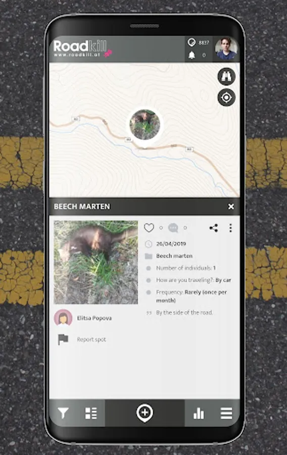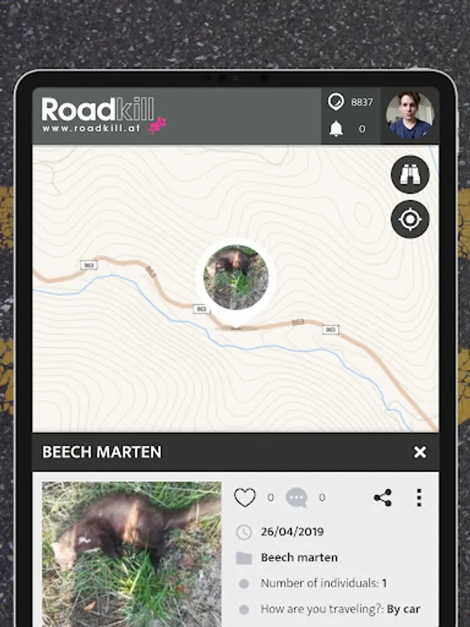 Your submissions actively help in a scientific project on the subject of "Roadkills". Your entries are used to determine which animals are killed where on the streets and what reasons there might be.