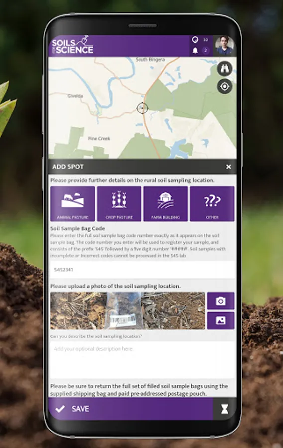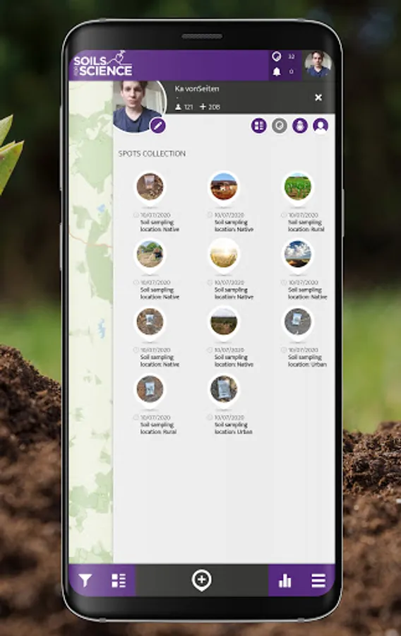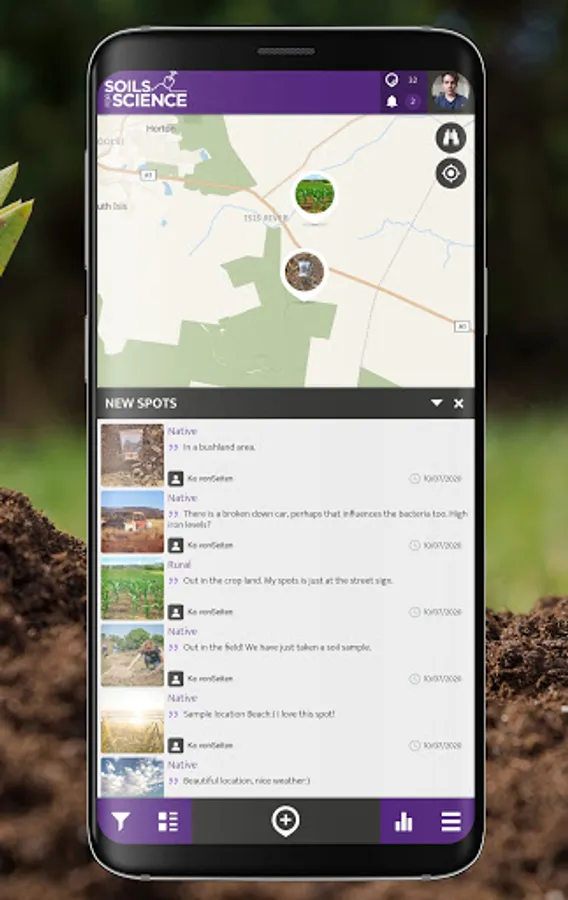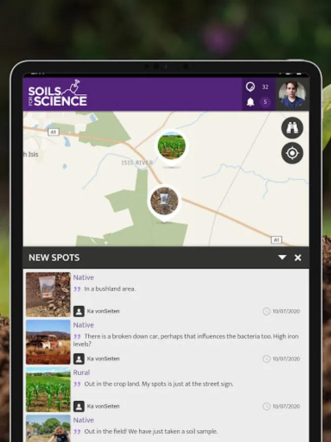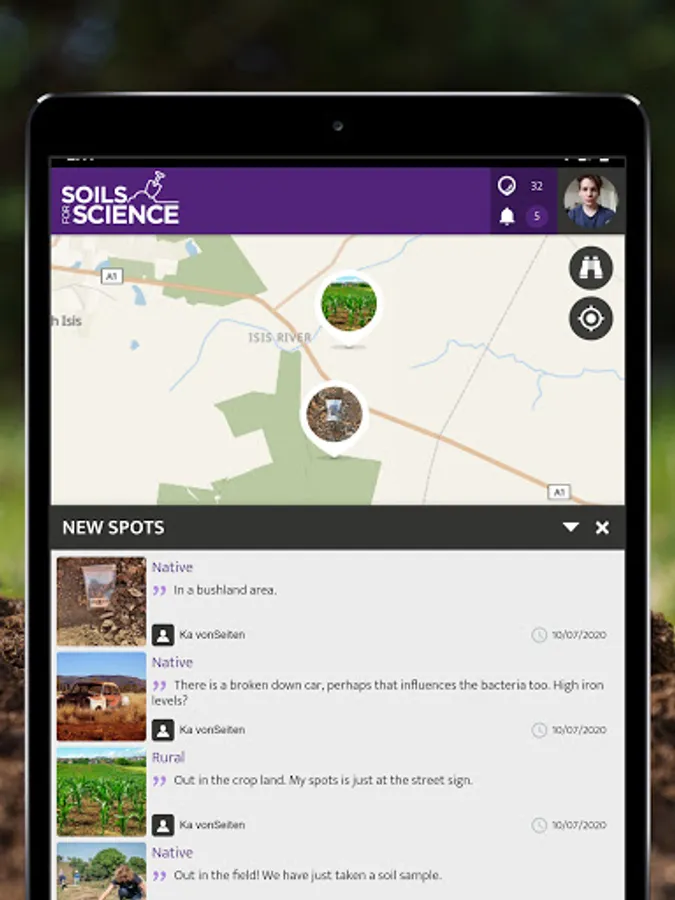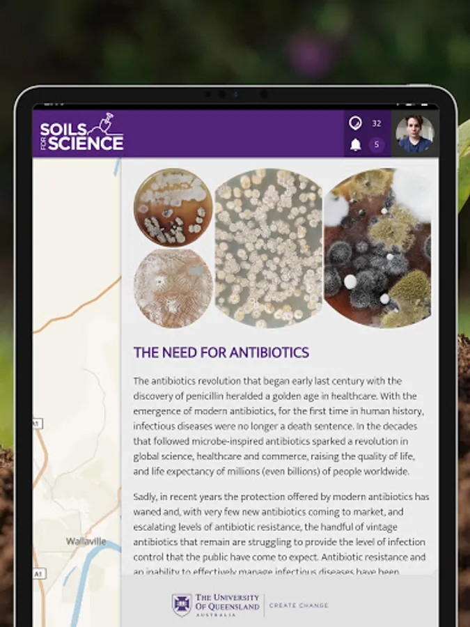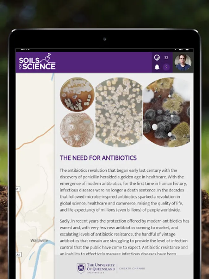 SOILS FOR SCIENCE Soils for Science (S4S) is a citizen science initiative of The University of Queensland, Institute for Molecular Bioscience. S4S provides the public with free sampling kits (visit soilsforscience.org.au) to collect soil samples rich in microbial biodiversity (bacteria and fungi). Pure microbes will be isolated by UQ researchers and used as a resource to search for new and improved antibiotics. High-resolution images of the microbial communities found in each soil sample will be uploaded to the S4S website, where the public can find their own sample(s), to zoom in and view the marvellous and miniature world of microbes. The App itself is running on the SPOTTERON Citizen Science platform.
