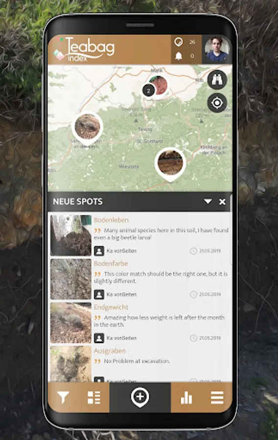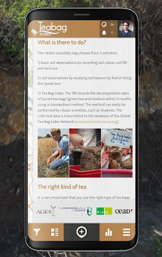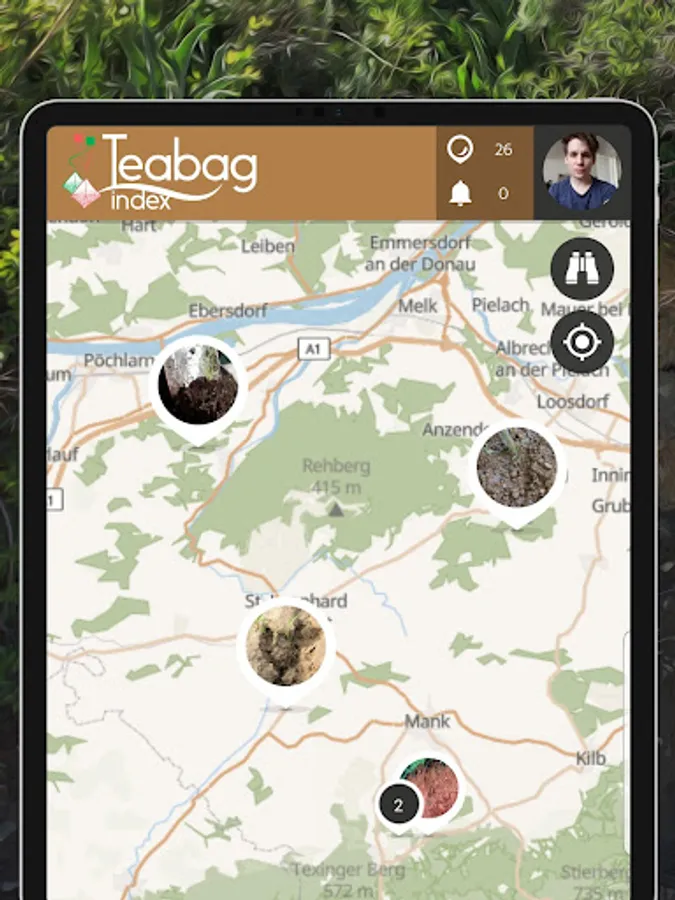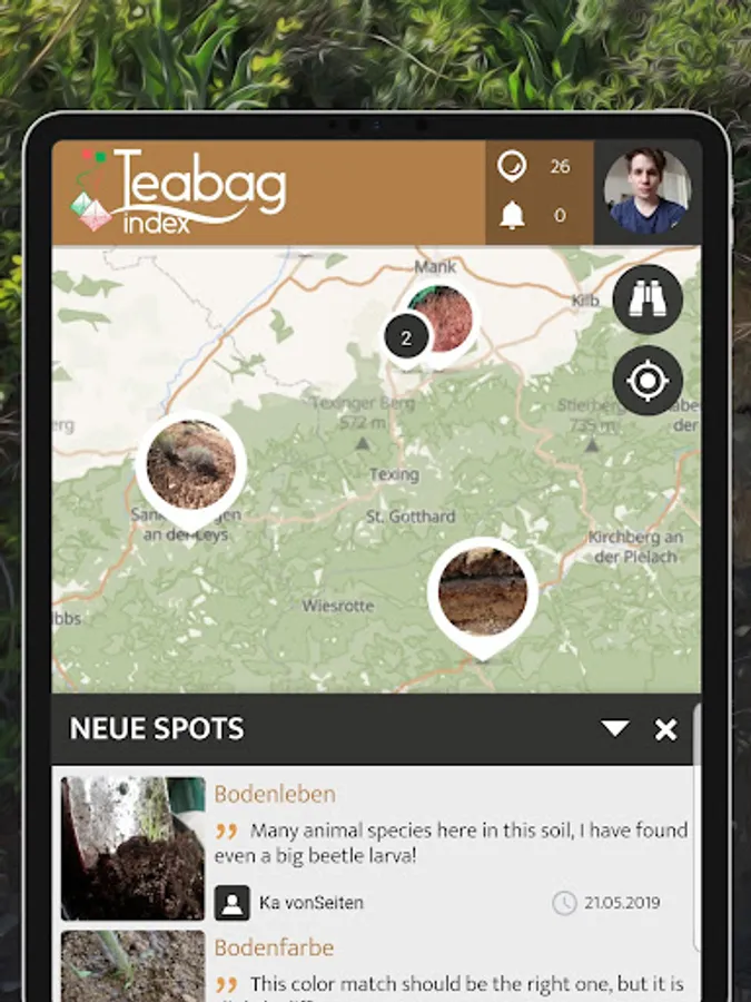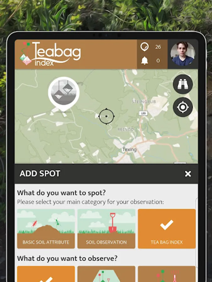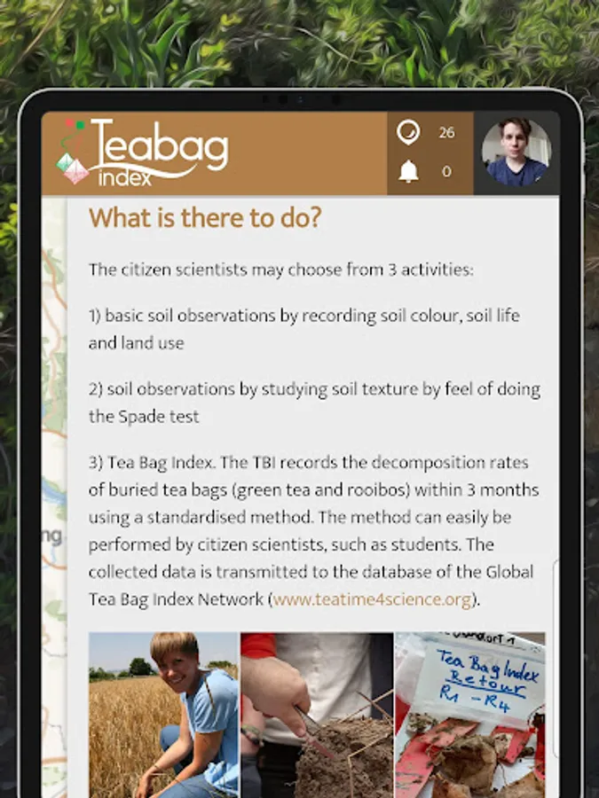 The educational App Tea Bag Index (TBI) collects data on soil observations and on soil decomposition dynamics in particular. The decomposition of organic matter in the soil is part of the global carbon cycle that provide information on the biological activity of the soil and is therefore important for climate change. Changes in the carbon content of soil can both intensify and mitigate climate change.
