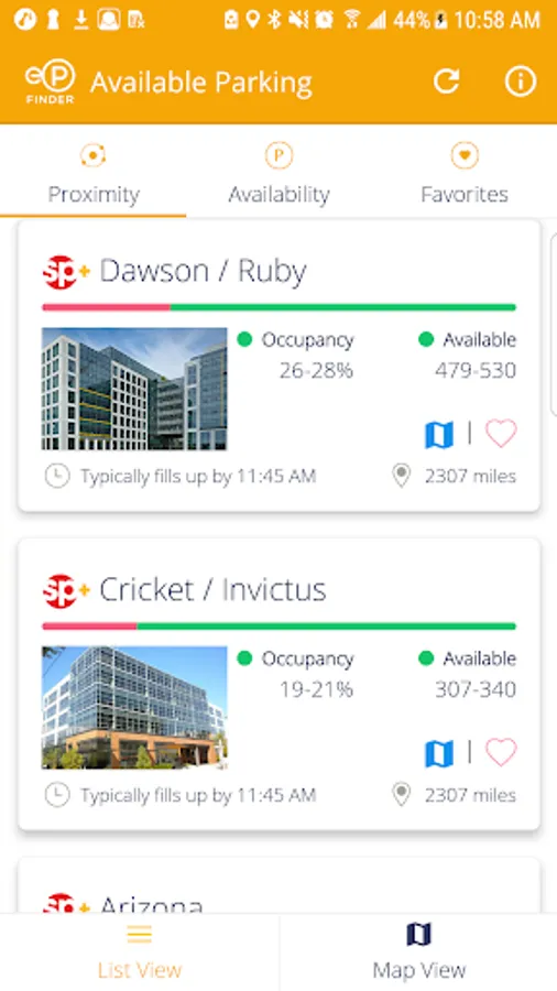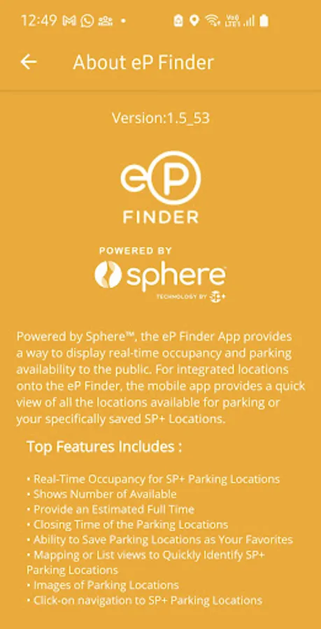 Powered by Sphere™ technology, the eP Finder App provides a way to display real time occupancy and parking availability to the public. For integrated locations onto the eP Finder, the mobile app provides a quick view of all the locations available for parking or your specifically saved SP+ Locations.