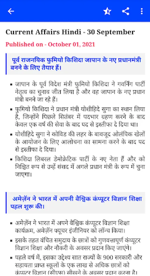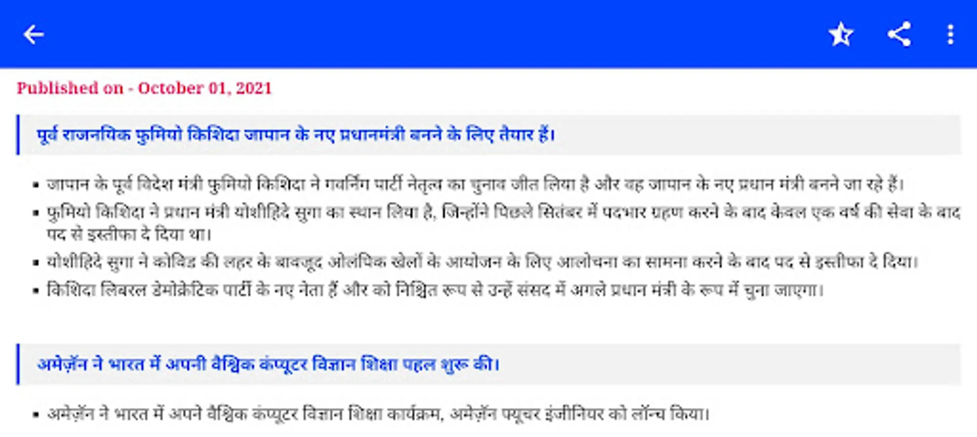 1. Current Affairs - You will be provided Daily Current Affairs in this App as - Updated News, Today's Events, Trending Topics related to present time .