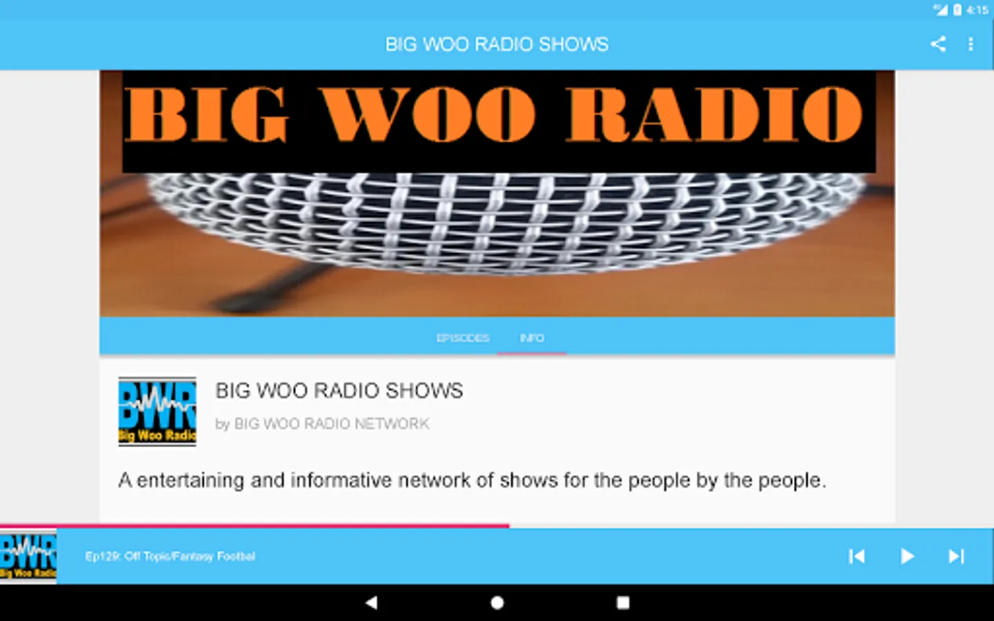 This app features a network that provides shows for the people by the people. Sports talk shows like "Off Topic with Big Woo, JT, JB and Doni". Entertainment shows like "The Floetic Poetry Show" a show that will enlighten your mind, arouse your intellect, as well as your loins. A show with a featured segment called "Brutally Honest". This segment puts new and upcoming entertainers in the spotlight to be critiqued by professionals in that particular field. Whether it's music, poetry or comedy there will be someone on the panel to give the new artist/entertainer advice on how to get better. All of our shows are designed to entertain, inform and uplift the spirits of our listeners. The guest we have on our shows are from all walks of life. From Hip Hop artists to Authors, from Preachers to Poets and From Athletes to Activists, but the most important people to our network is you the listener.