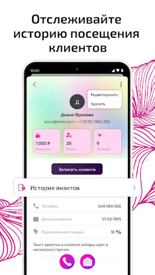 - Specify personal discounts for each client. - Enter clients from the phone book or create manually