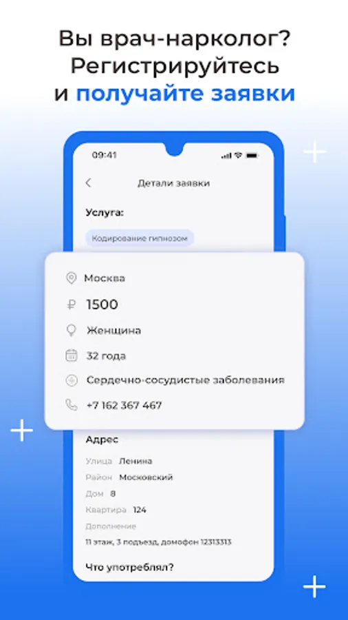 Наше приложение позволяет быстро и анонимно вызвать врача-нарколога на дом для скорейшего снятия симптомов интоксикации.