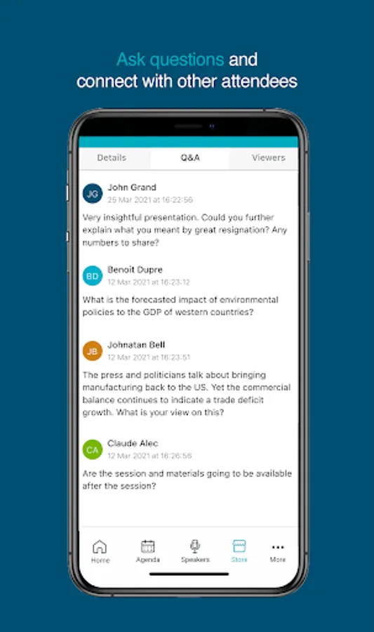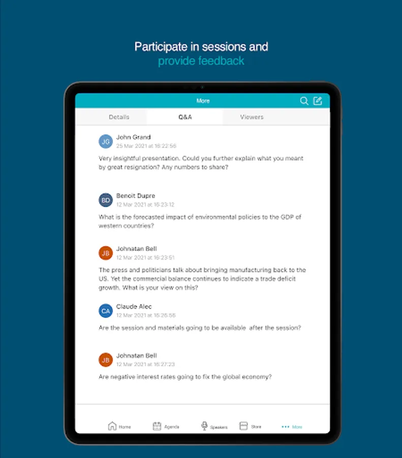Participants can message, exchange contacts, arrange to meet up, receive a personalised agenda, participate in live surveys and Q&A.