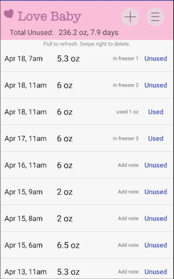 This app is very light, which means it will be fast to open or close. It is very easy to use. Just with a couple of taps and entering the number you pump you have your data entered. The present time will be recorded as default date and time. You can change it after the entry is created. You may enter note for each entry. The app calculates the total amount of milk you have and the number of days that your supply will approximately last. If you think of some feature we don't have, please let us know! Thank you!