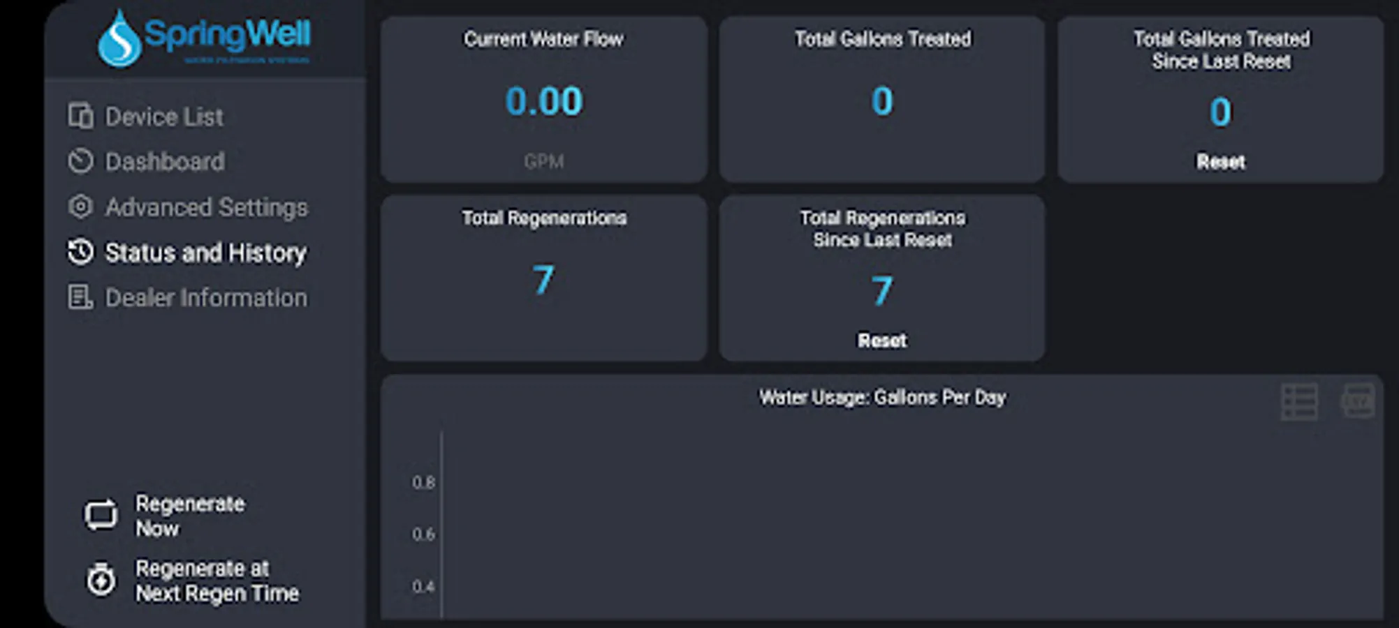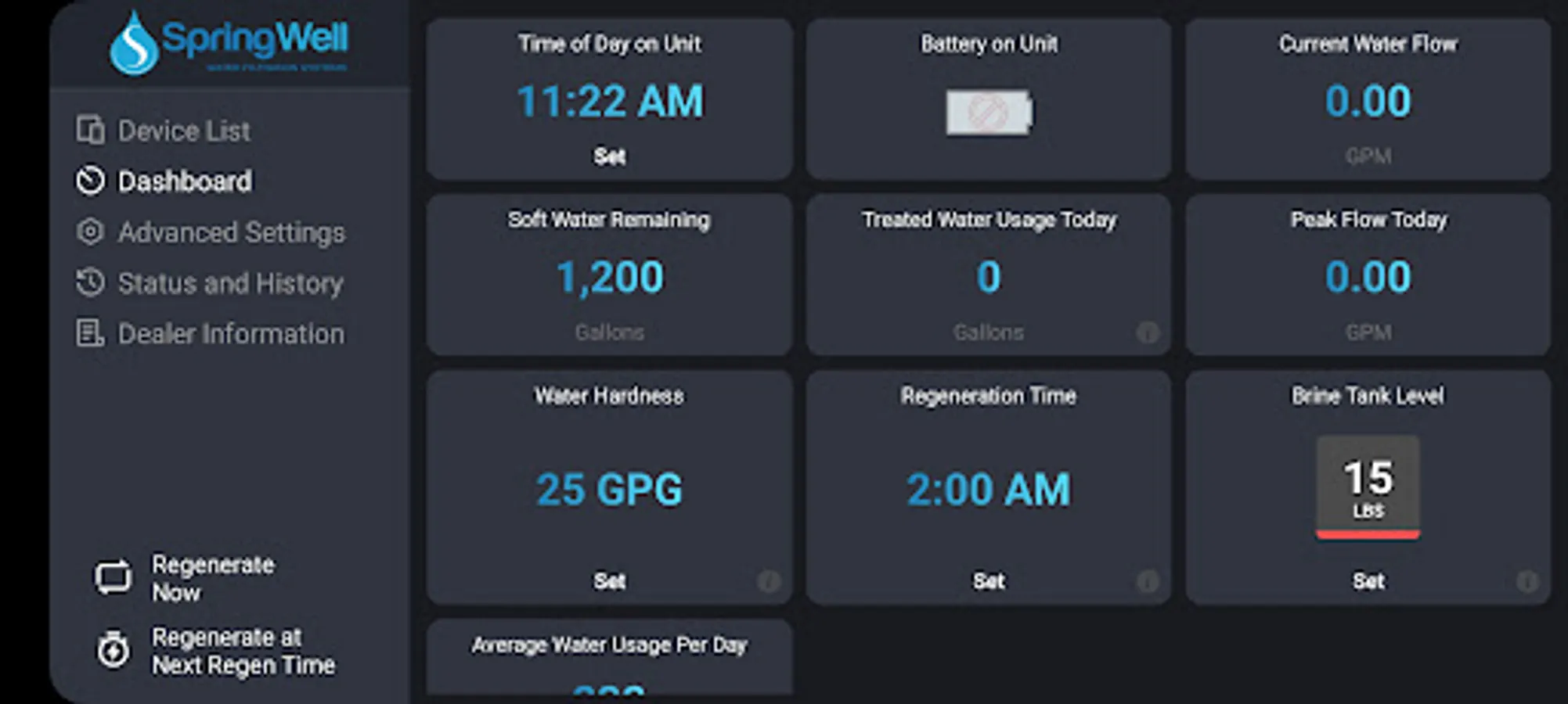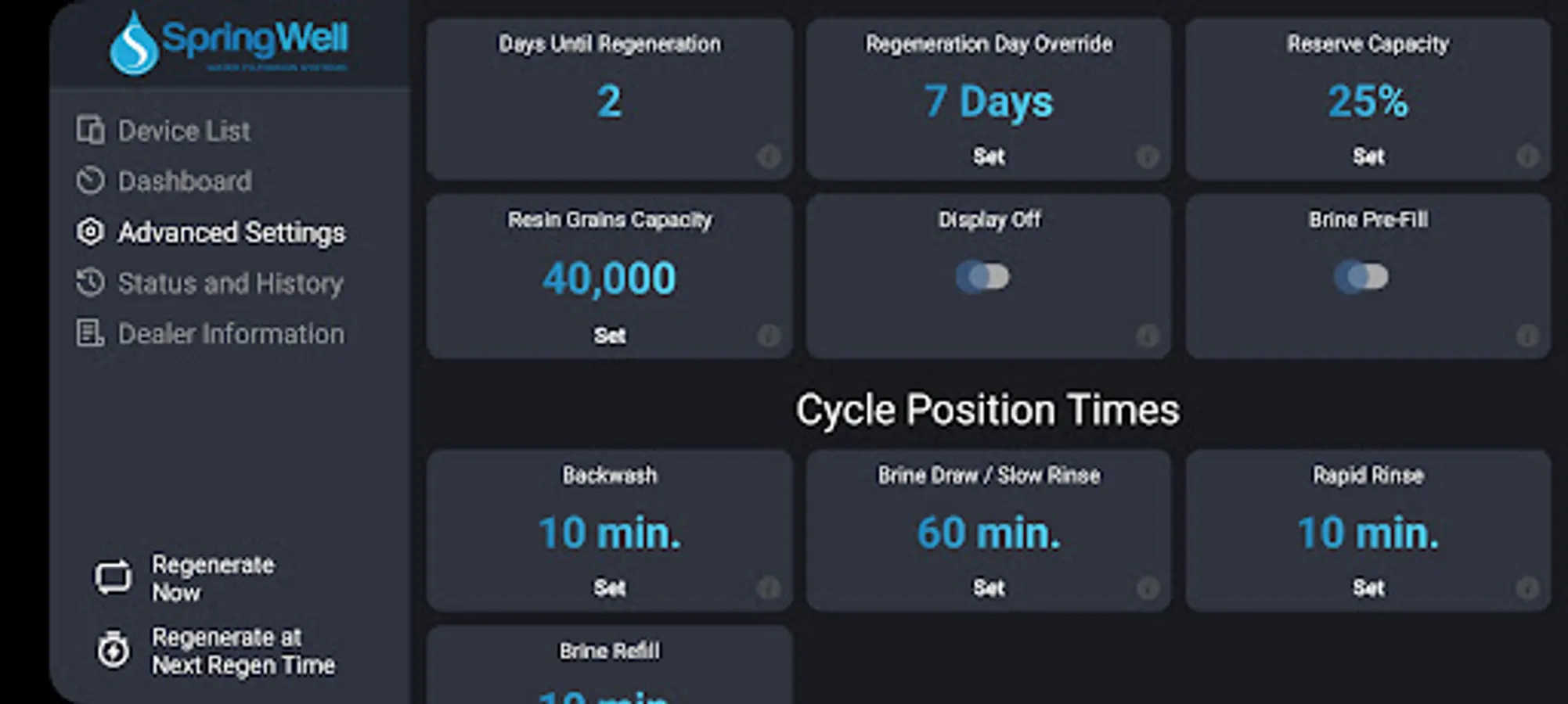 SpringWell Water Smart App makes setting up and monitoring your water treatment system easier than ever! When used with a SpringWell Water Filtration Systems valve, the user, through the app, can do the following functions: