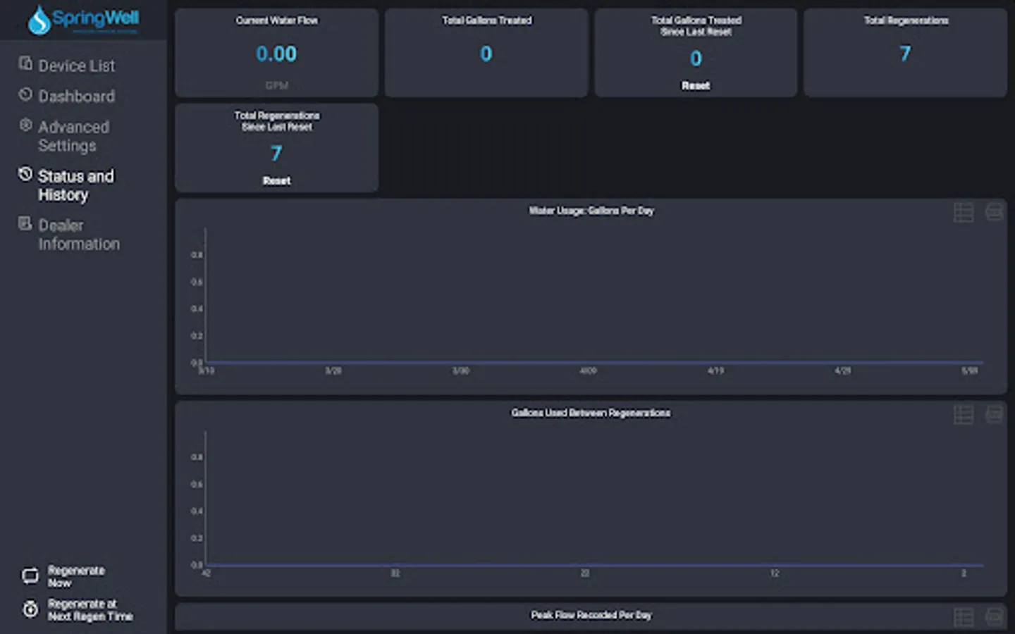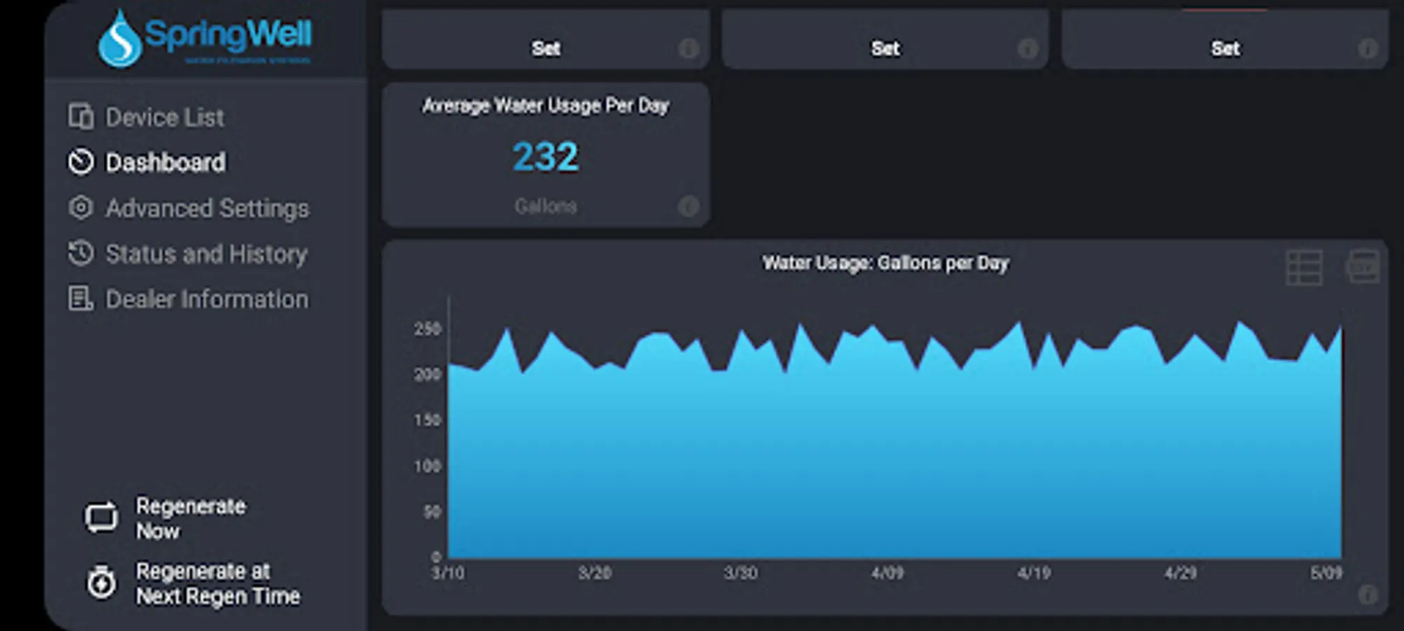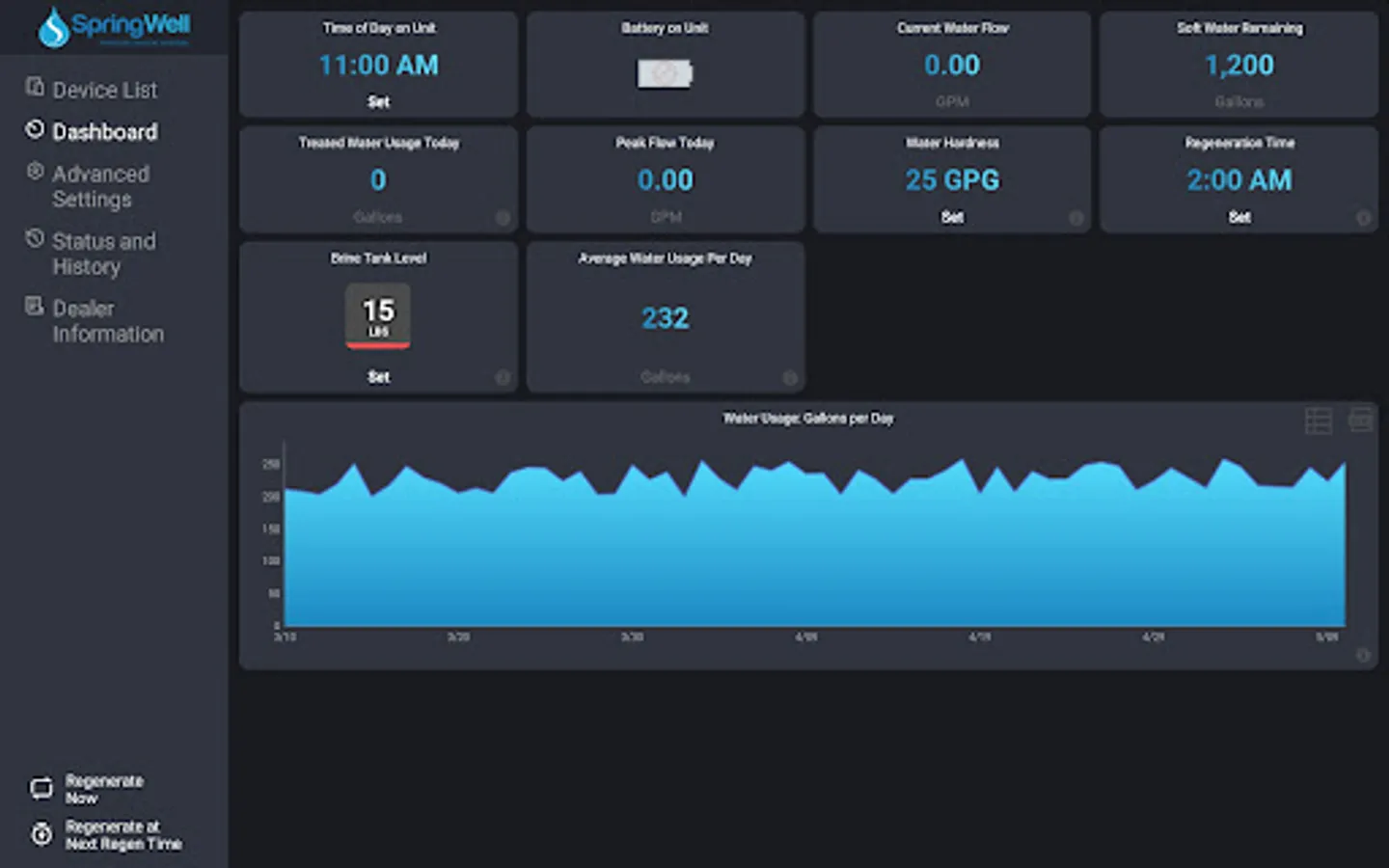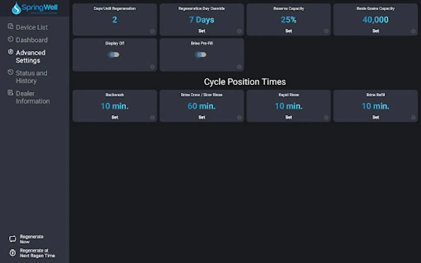 SpringWell Water Smart App makes setting up and monitoring your water treatment system easier than ever! When used with a SpringWell Water Filtration Systems valve, the user, through the app, can do the following functions: