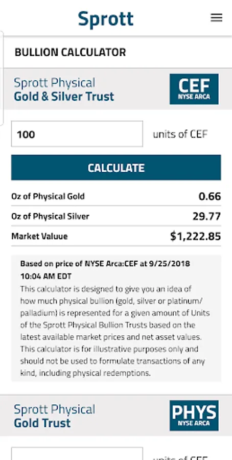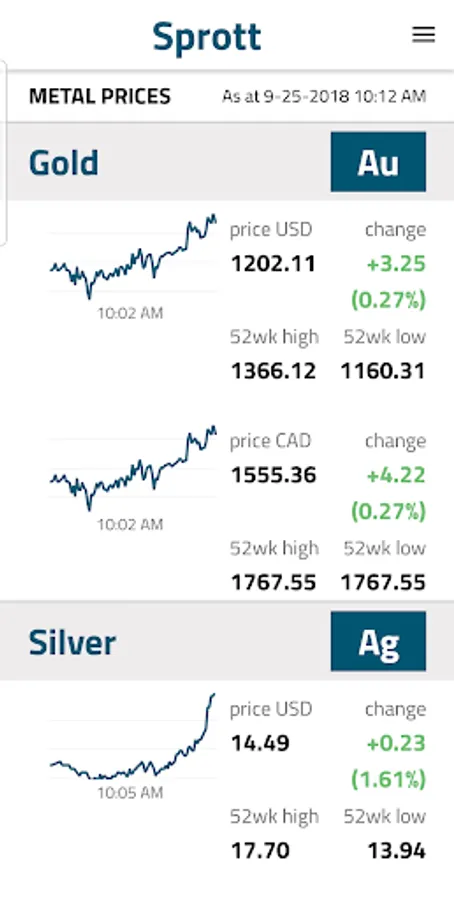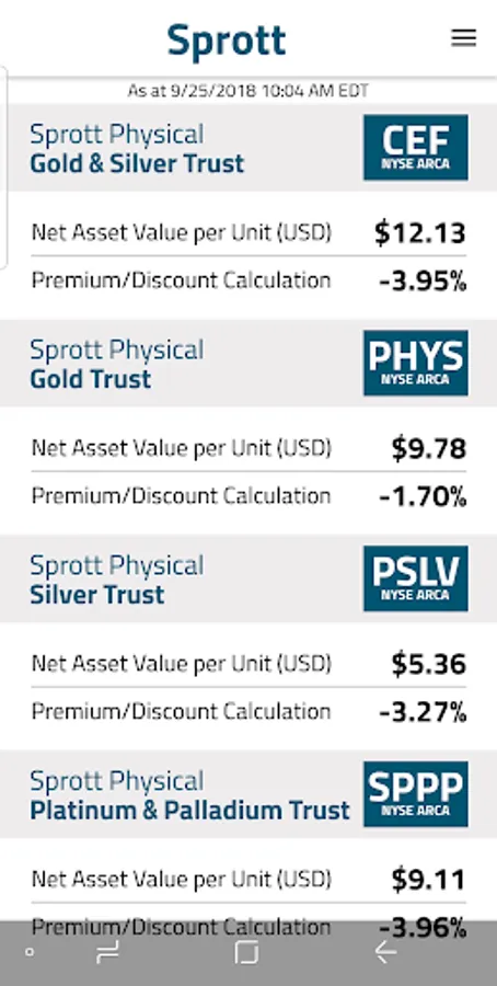 Sprott Tracker lets you follow the daily performance of your investments in gold, silver, platinum, palladium and uranium held in Sprott Physical Commodity Trusts. Get the latest market prices, NAVs, premium/ discount calculations, trading volume and more.