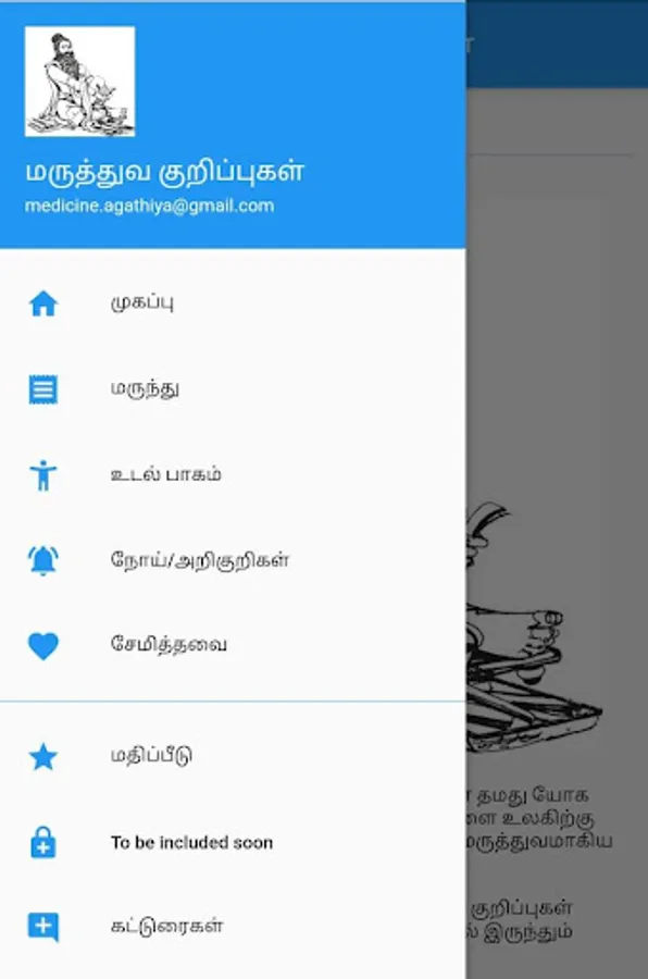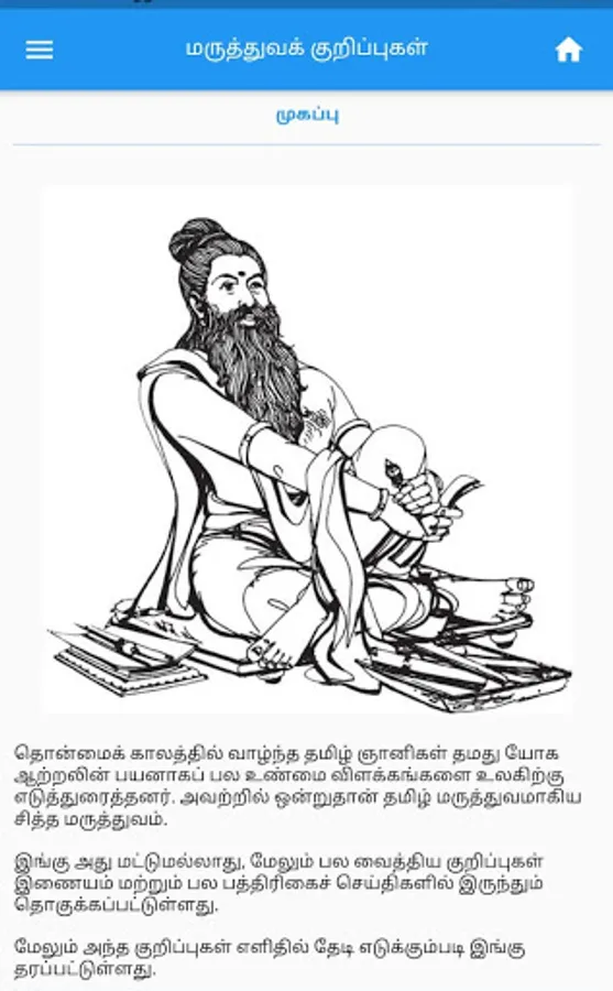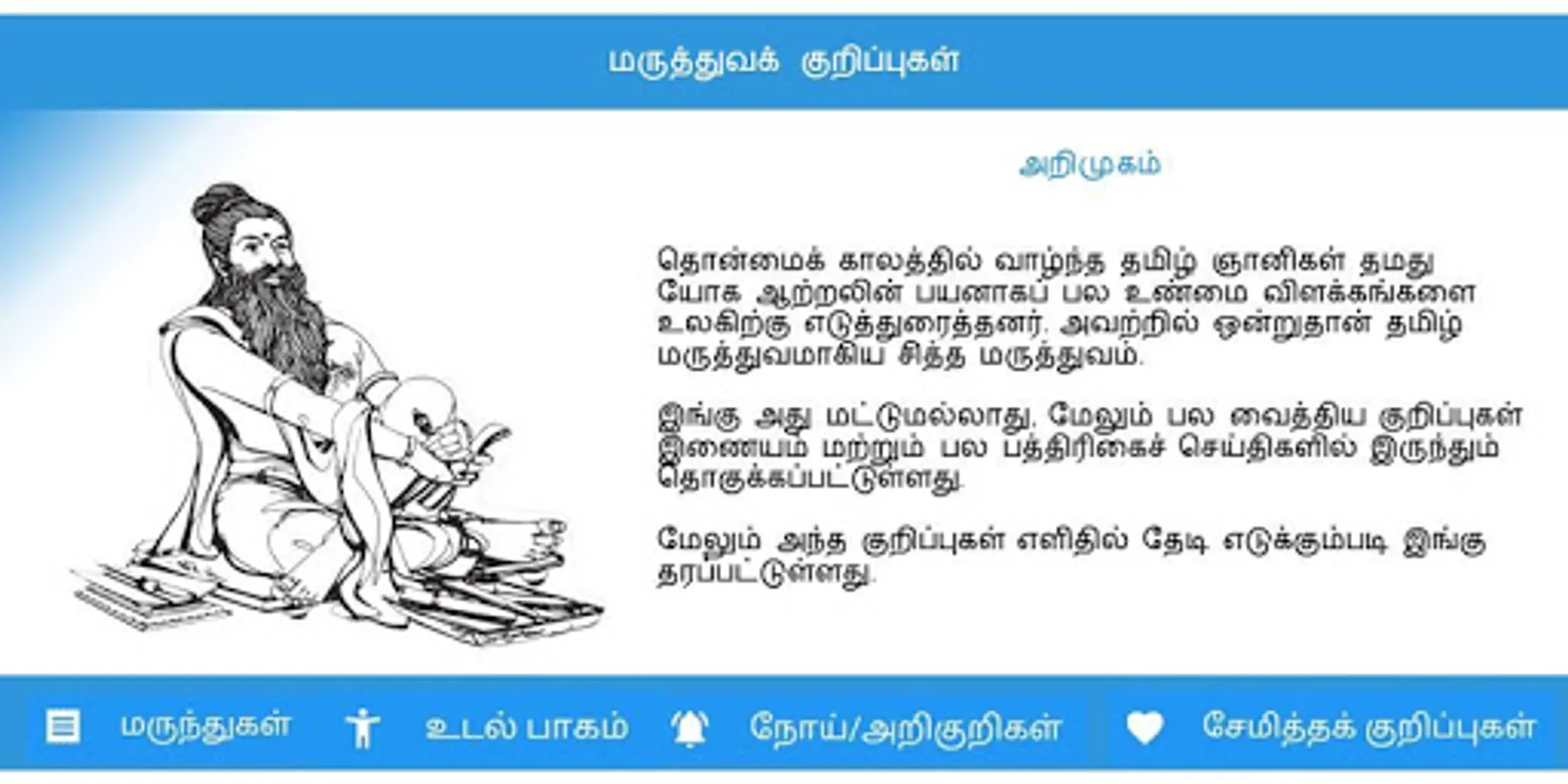 Tamil Medical Notes is an application created to promote Tamil medicine usage. It is collection of Tamil medical notes from various sources like newspapers and blogs available in internet. We collected all the Tamil siddha medical notes and we put together and we made searching very simple.