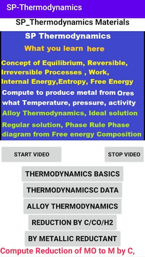 Learn Thermodynamics of Materials through this App, laws of thermodynamics, Enthalpy, Entropy, Free Energy, Alloy Thermodynamics. Application of thermodynamics to find the conditions of Metals production from Ores or metallic compounds.
