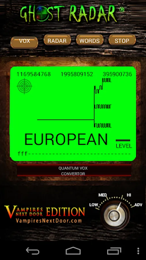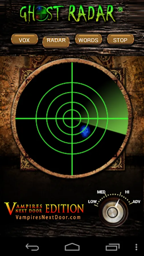 Ghost Radar®: VAMPIRES is the latest edition to Spud Pickles line of Ghost Radar® products. This application is designed to detect paranormal activity. Ghost Radar®: VAMPIRES attempts to detect paranormal activity by making various readings on the device. Traditional paranormal equipment can be easily fooled when simple mundane bursts of normal energy occur. Ghost Radar®: VAMPIRES sets itself apart by analyzing the readings and giving indications only when interesting patterns in the readings have been made. Ghost Radar®: VAMPIRES also includes a voice to let you know when interesting words have been detected. Please note we offer no guarantees of accuracy or any warranties, therefore, since results from this application cannot be verified scientifically the app should be used for entertainment purposes.