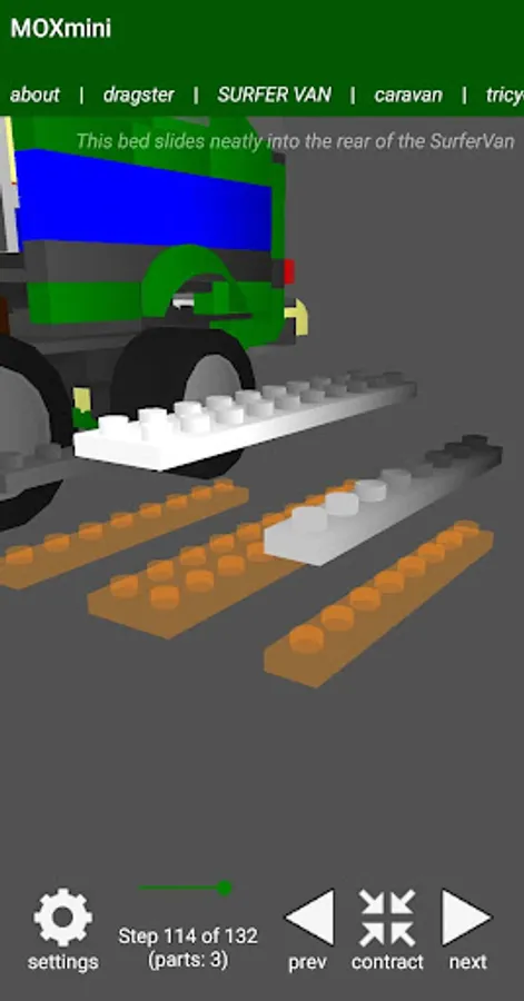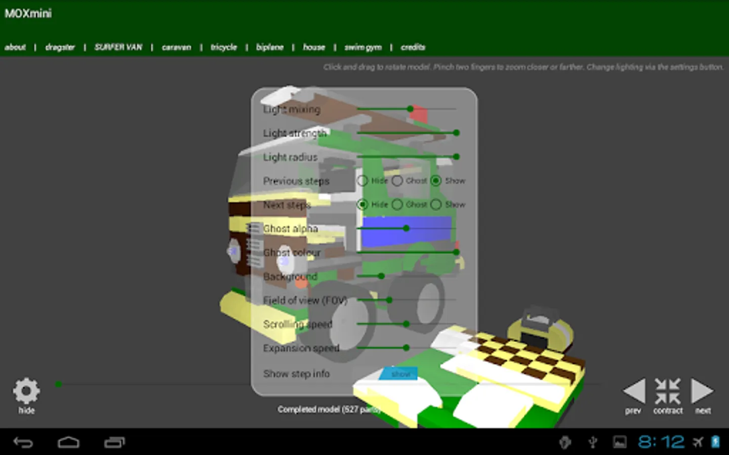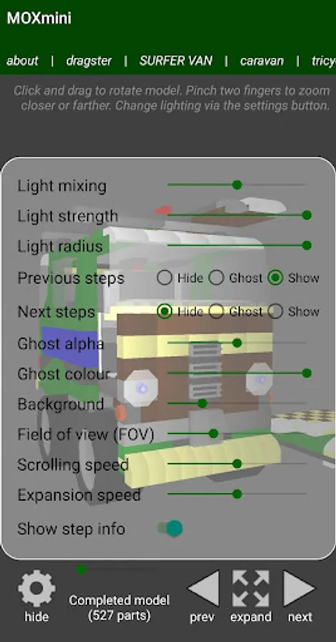 The interactive 3D can be moved to any angle, zoomed in and out. Lighting is fully adjustable, as well as other features such as "ghosting" of previous steps and steps to be done, so you will always know where you are up to and where parts should be placed.