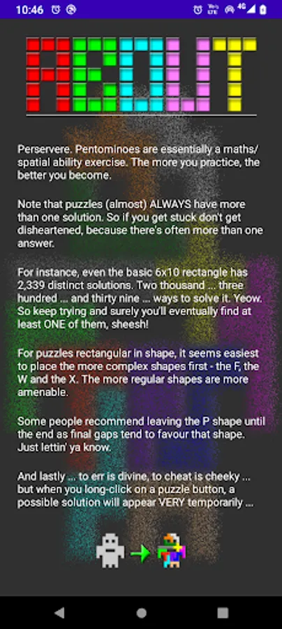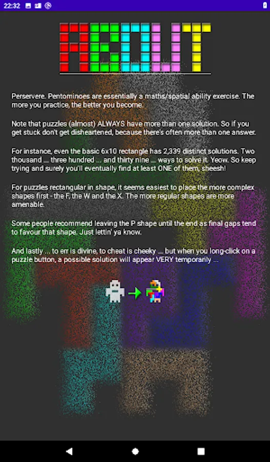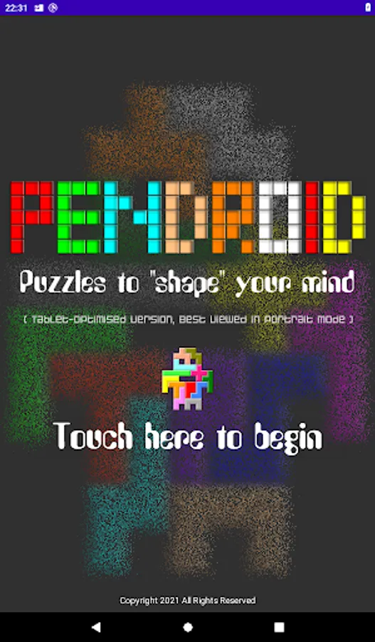 Pendroid is a puzzle app using pentominoes - geometric shapes made from five squares combined in different ways. The concept was proposed in a 1965 book "Polyominoes" by Professor Solomon Goulomb.