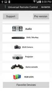 Supported devices : TV , Cable box , Air Conditioner , DVD / Blu Ray Player , Projector , Home cinema , Car Audio , Hi Fi , Game console , DSLR Camera , RGB LED .