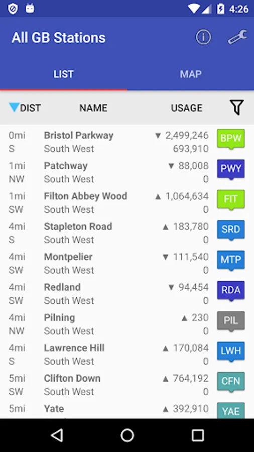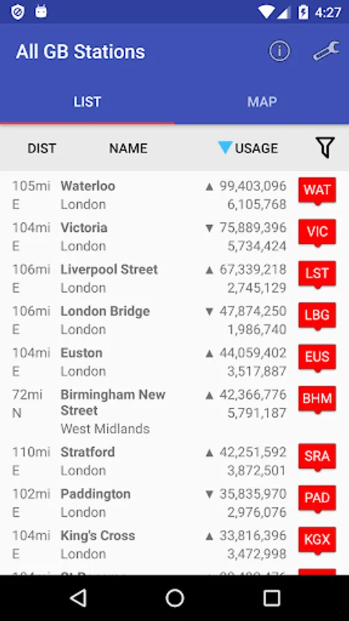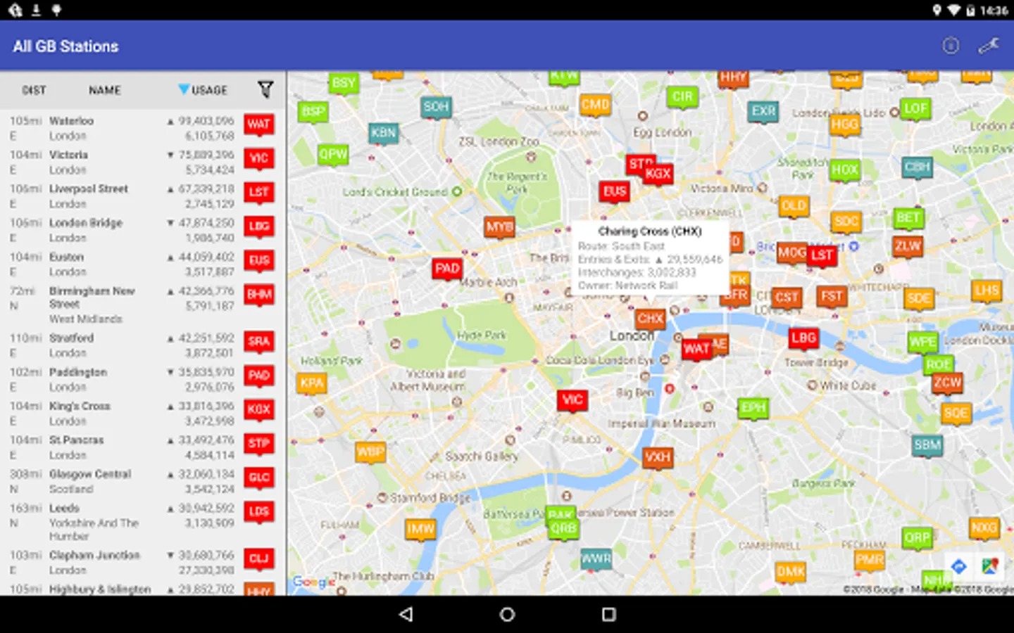 Explore all the railway stations in Great Britain using this interactive app. The stations are colour-coded according to the estimated numbers of passengers using each station, with warmer colours representing the busiest stations. The distance of each station from the current location is also shown. The stations can be filtered and sorted by region, passenger usage numbers, or distance.