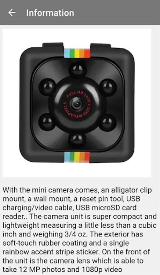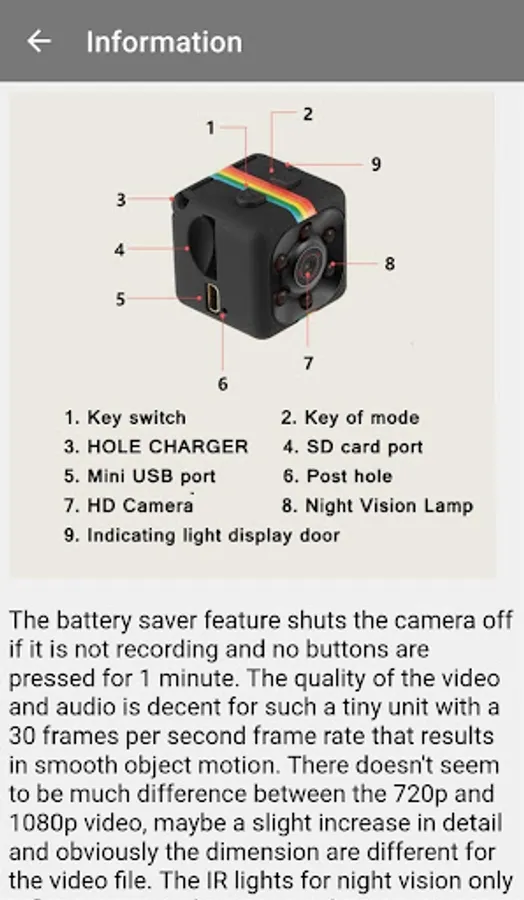 In the content of this mobile app, you can find explanations containing the above titles. This app is a guide with information about Sq11 Mini dv Camera.