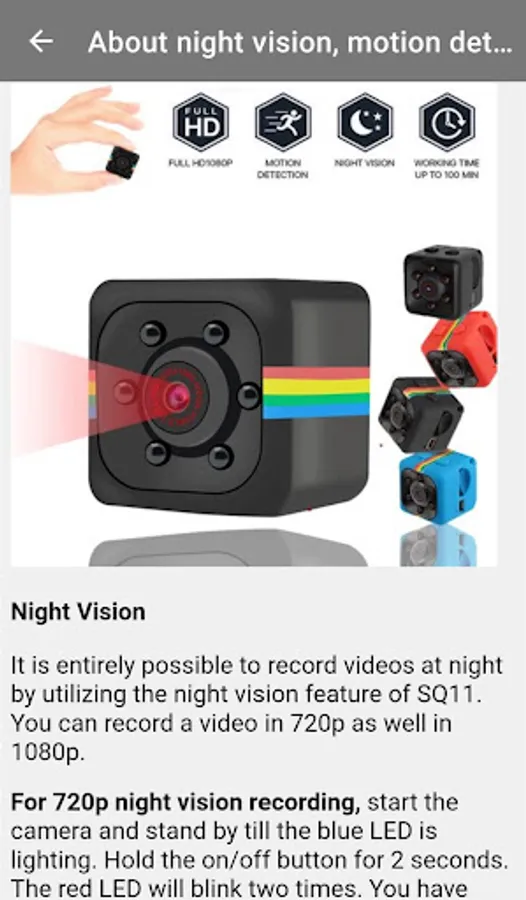 You can find what you are wondering about the Sq11 mini dv camera in the app. How to setup, capturing photos, recording videos, resetting your device, Sq11 mini camera features and frequently asked questions. The fact that the device is small, portable and has high resolution allows you to have a very practical product.