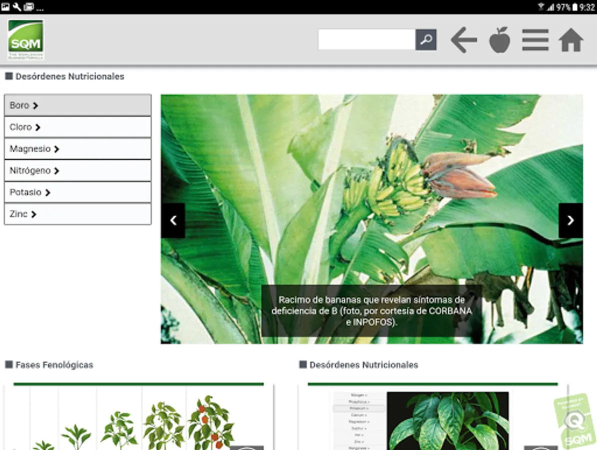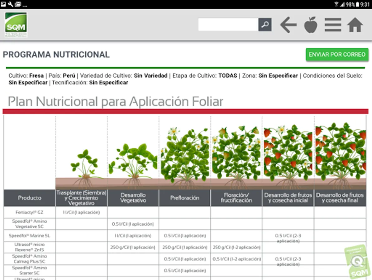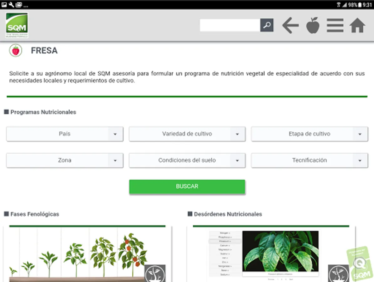 You can also find crop information; What are their phenological stages, reference images of nutritional disorders or obtain the fertigation programs recommended by SQM for each crop.