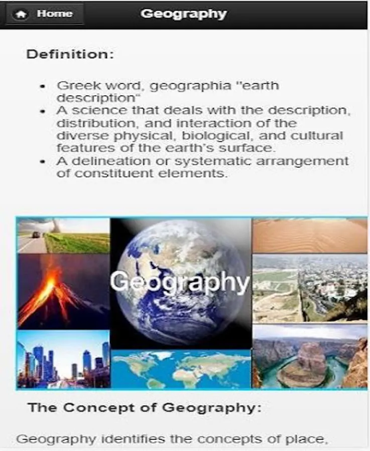 Geography is a field of science devoted to the study of the lands, features, inhabitants, and phenomena of Earth.