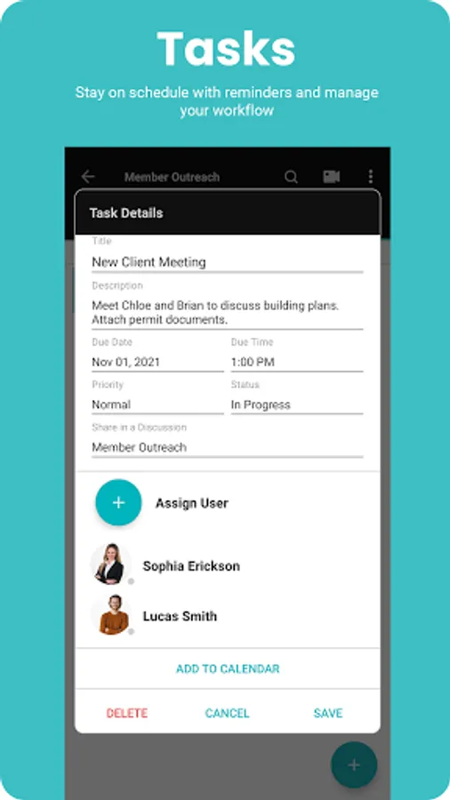 • Tasks keep everyone on schedule while tracking your team’s workflow.