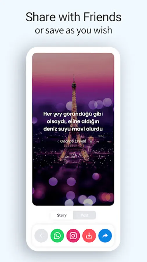 + Whether you want to add your own quote or select your favorite quotes from the library share with any social media you want.(Whatsapp, Instagram, Facebook and etc.)