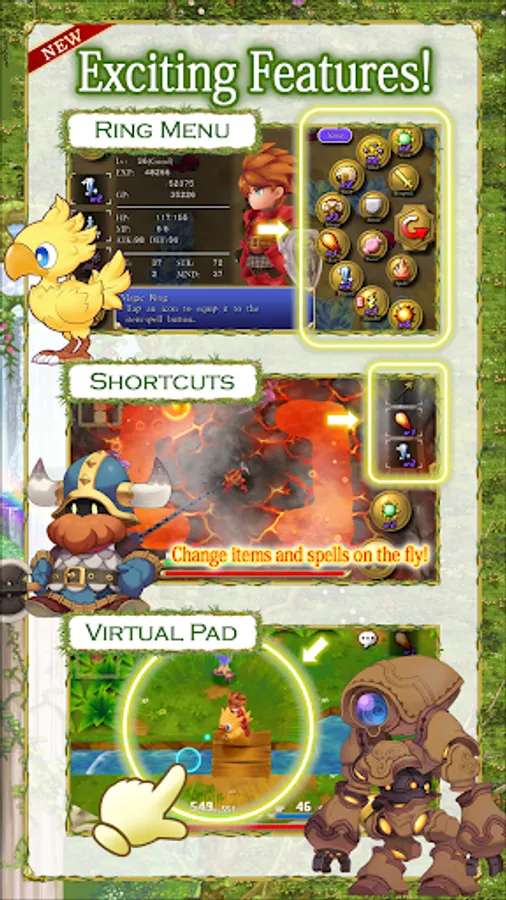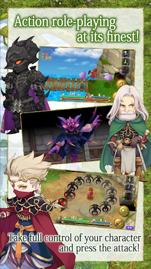 Player movement is achieved via a virtual joystick accessible anywhere on the screen. An auto-adjust feature has also been added so that even if your thumb strays from its original position, you will never lose control of the hero.