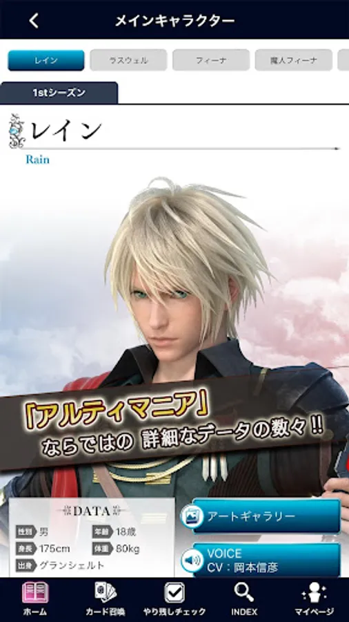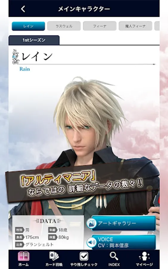You can browse various information such as main characters and sub-characters of "FFBE", character explanations such as successive FF characters, art galleries, and LB movies.