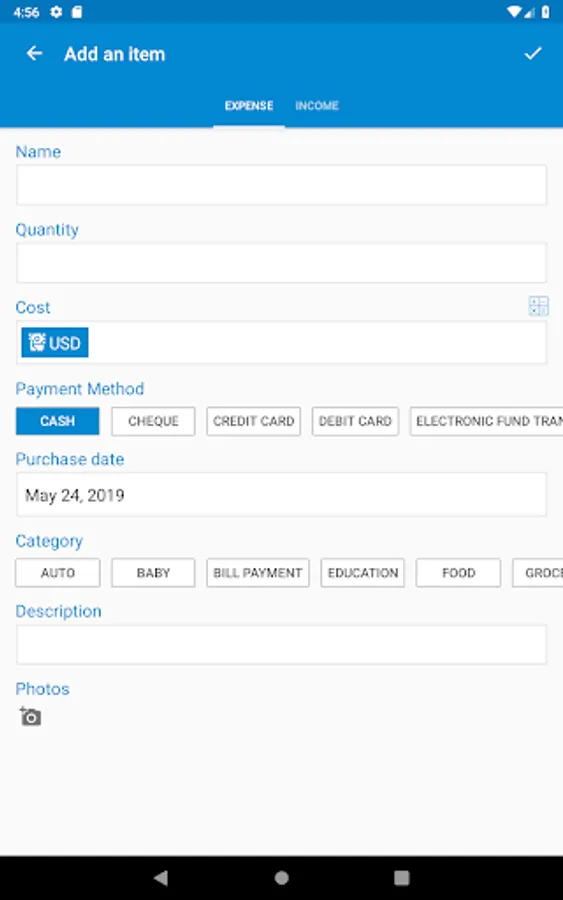 1- Enter Item name, purchase date, quantity, and cost of the item and other optional details you can keep with it like item’s images.