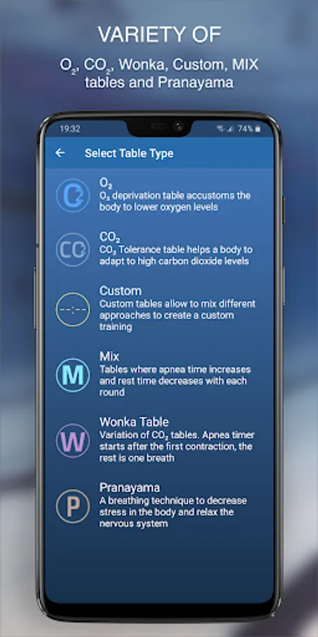 CO2 Tolerance table – helps a body to adapt to high carbon dioxide levels. This is achieved by decreasing the length of resting time between fixed breath-hold periods.