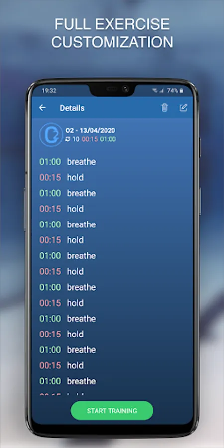 Each exercise can be edited by setting your own number of repetitions, breath hold time, rest time, etc.