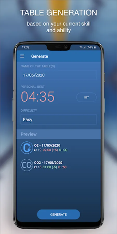 O2 deprivation table – accustoms a body to lower oxygen levels. This is achieved by increasing the amount of time that you hold your breath on each attempt, while the resting time is fixed.