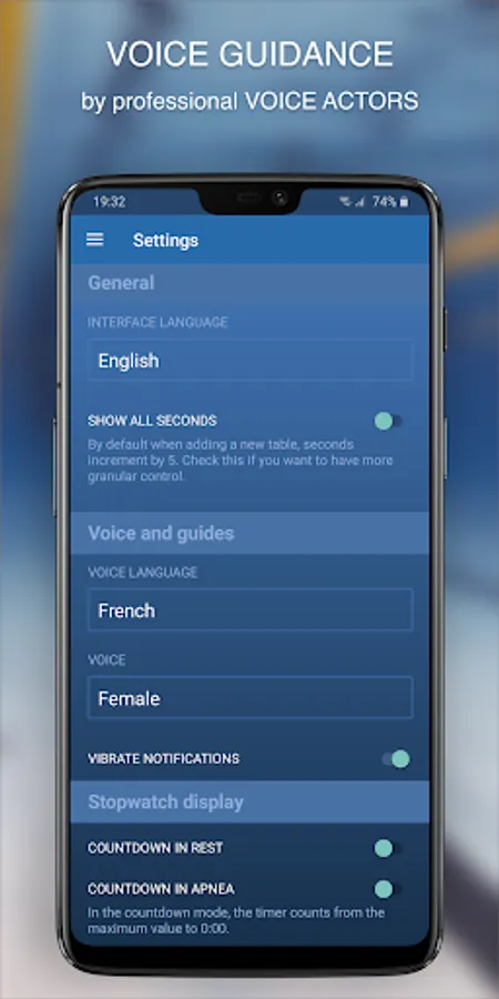 When you start working with the application, you set your personal record in breath holding. Based on this data, the app will offer a personalized training program with exercises of 3 difficulty levels to choose from: easy, normal and hard.