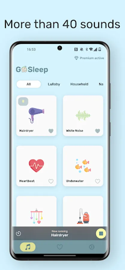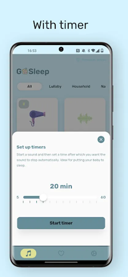 To start using GoSleep place your phone within audible distance of your baby but not too close to their head, choose one of the available sounds, set a timer and start playback.