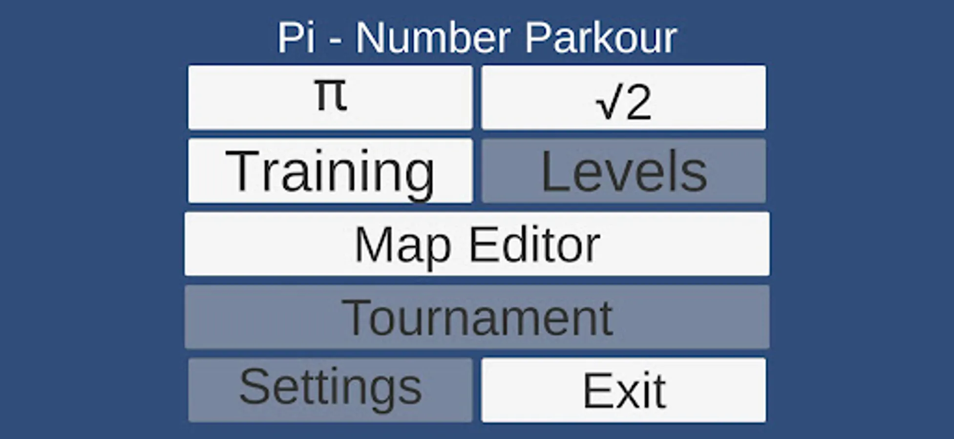 In Pi, you can play on a level out of digits. All of the digits are of different platform types. The Number Pi and the square root of 2 are also levels. There is a map editor, where you can create your own levels. But it isn't as easy as it seems, because you can fall through 8 and 2. There are also platforms for the letters A - G.